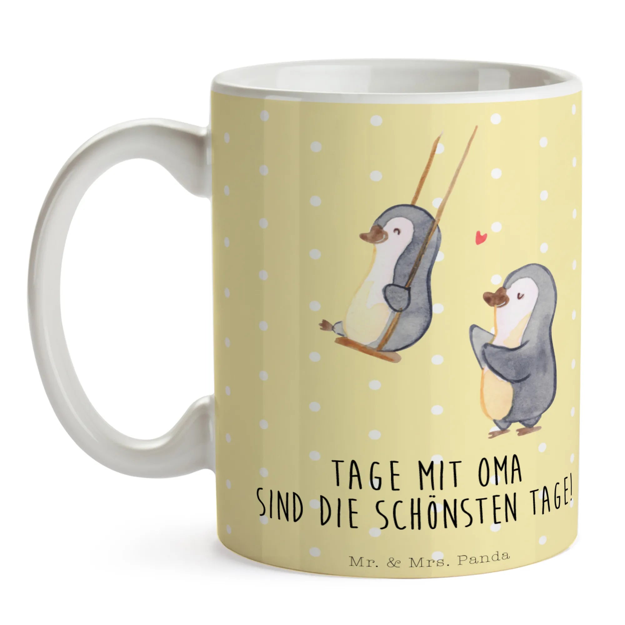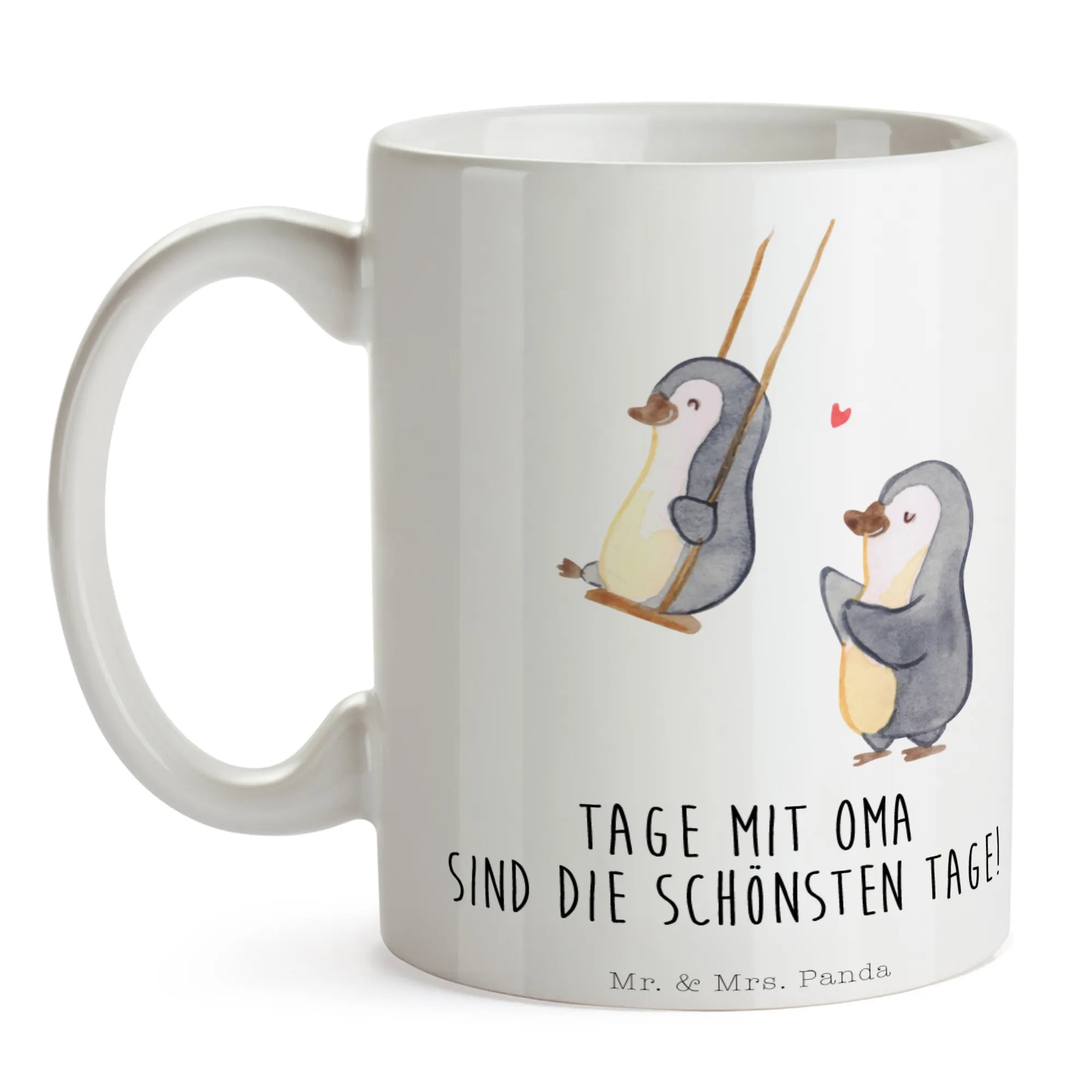 Mr. & Mrs. Panda Tasse „Pinguin Oma schaukeln“ – ein kleines Herzensgeschenk für Deine Lieblingsoma. Diese Keramiktasse vereint ein liebevolles Motiv mit dem herzlichen Spruch „Tage mit Oma