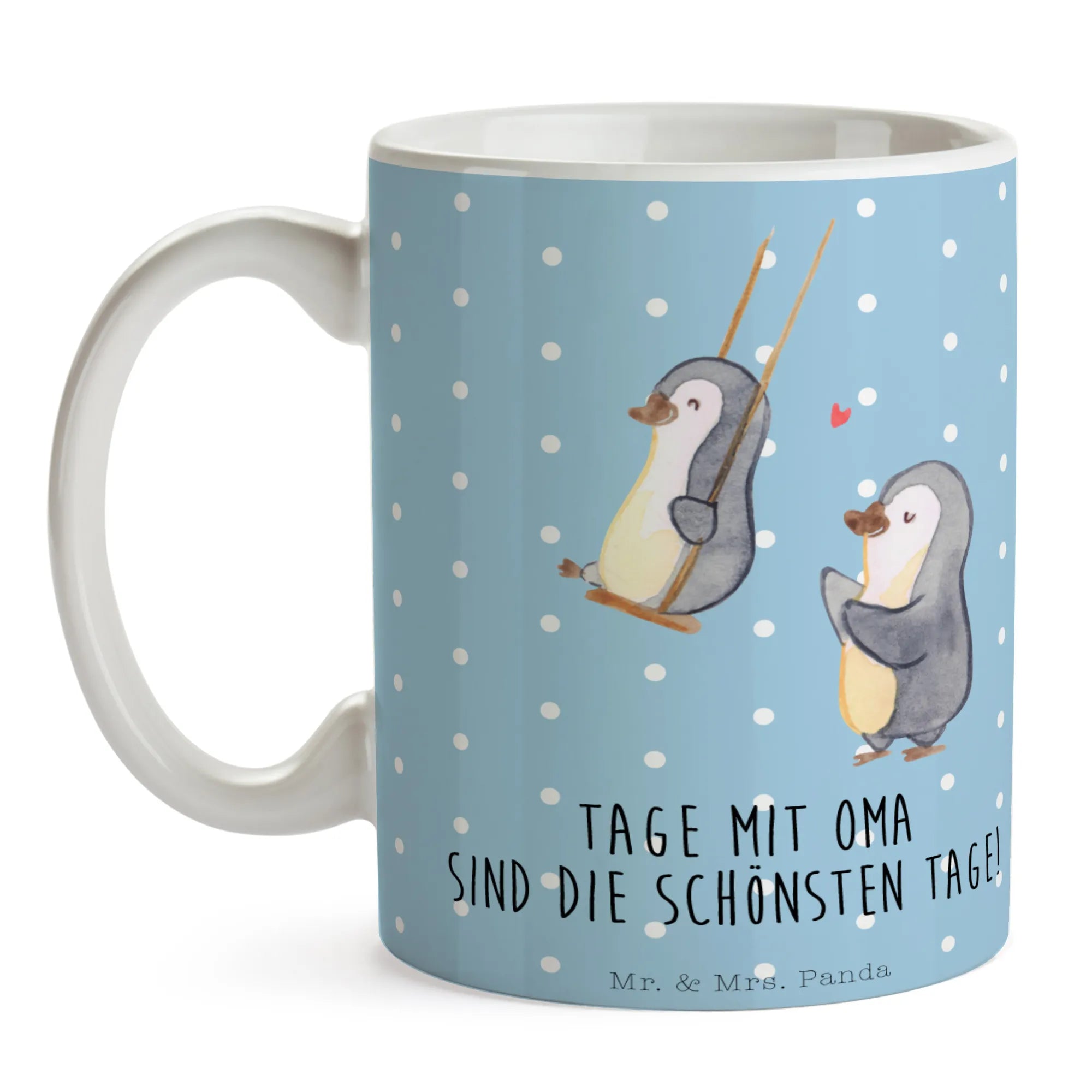 Mit unserer bezaubernden Tasse „Pinguin Oma schaukeln“ triffst du genau ins Herz. Das liebevoll handgezeichnete Motiv aus der Familien Kollektion zeigt zwei entzückende Pinguine auf Schaukeln, ein kleines Herz schwebt über ihnen und der fröhliche Spruch „Tage mit Oma sind die schönsten Tage!“ macht die Tasse zur perfekten Geschenktasse für Oma.
