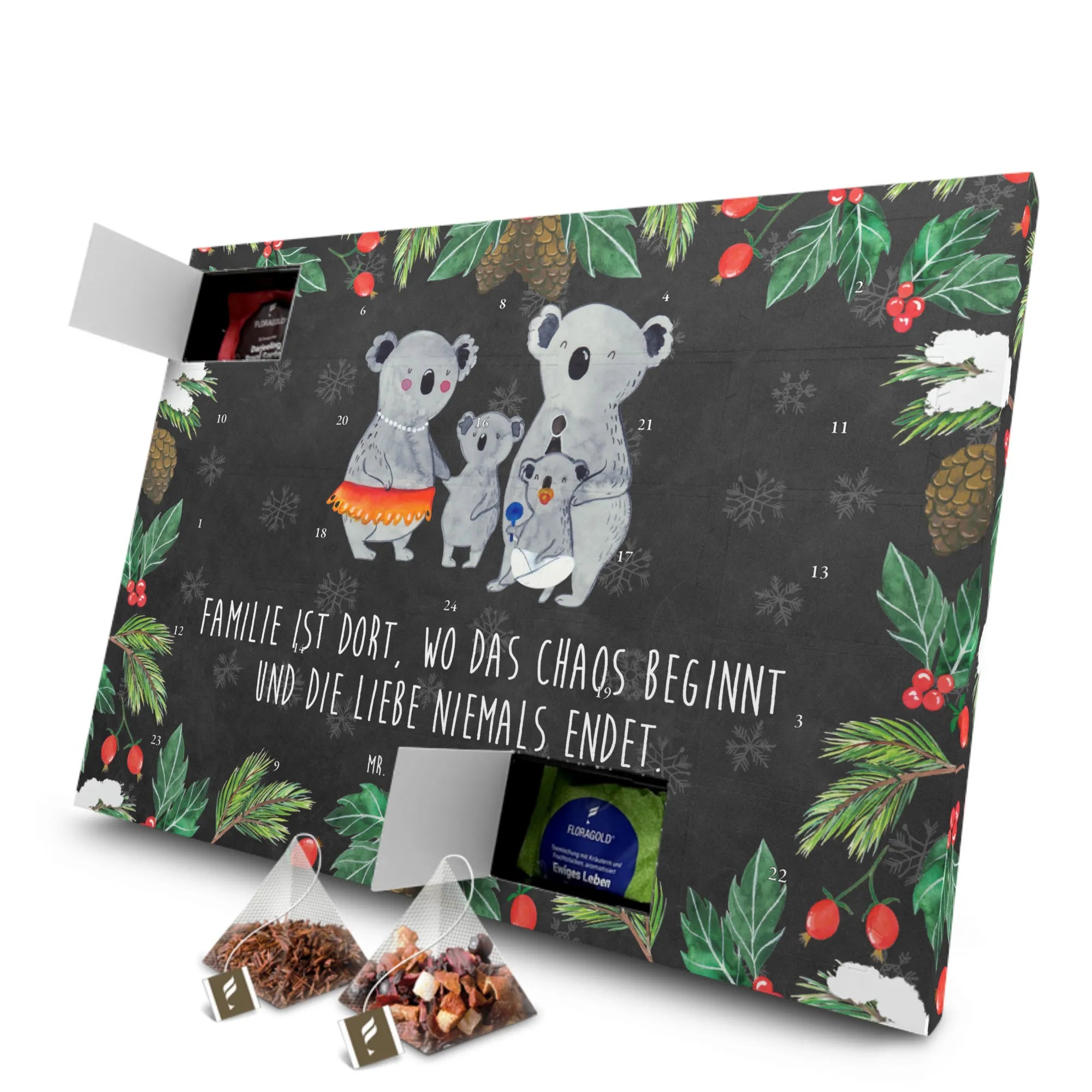 Der wunderschöne Tee Adventskalender von Mr. & Mrs. Panda ist das perfekte Geschenk für alle Familienmitglieder und Tee-Liebhaber. Mit dem niedlichen Motiv der Koala Familie, die aus zwei größeren und zwei kleineren Koalas besteht, versprüht dieser Adventskalender viel Freude und Wärme. Der Slogan "Familie ist dort, wo das Chaos beginnt und die Liebe niemals endet" macht ihn nicht nur zu einem hübschen Deko-Artikel, sondern auch zu einem ganz besonderen Botschafter für familiäre Verbundenheit.