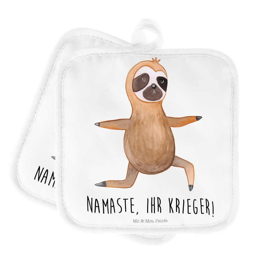 Mit viel Liebe aus der Faultier - Kollektion von Mr. & Mrs. Panda: Zwei niedliche Topflappen, die ein zufriedenes Faultier in der Krieger-Asana zeigen – begleitet vom charmanten Spruch „Namaste, ihr Krieger!“. Dieses Topflappenset verbindet praktischen Schutz mit einem herzlichen Lächeln und bringt Entspannung in deine Küche.