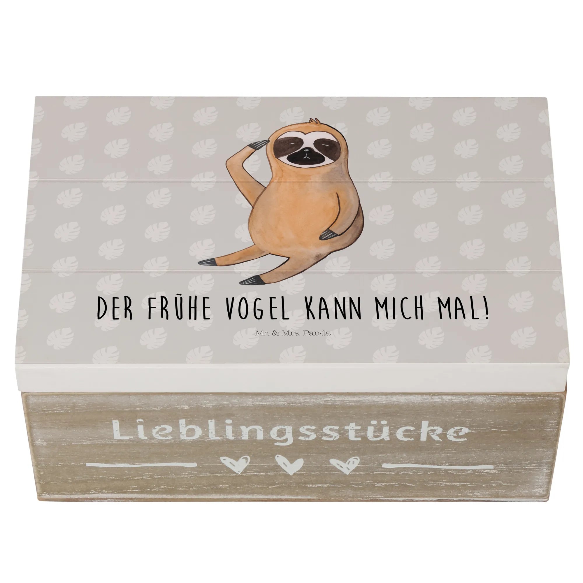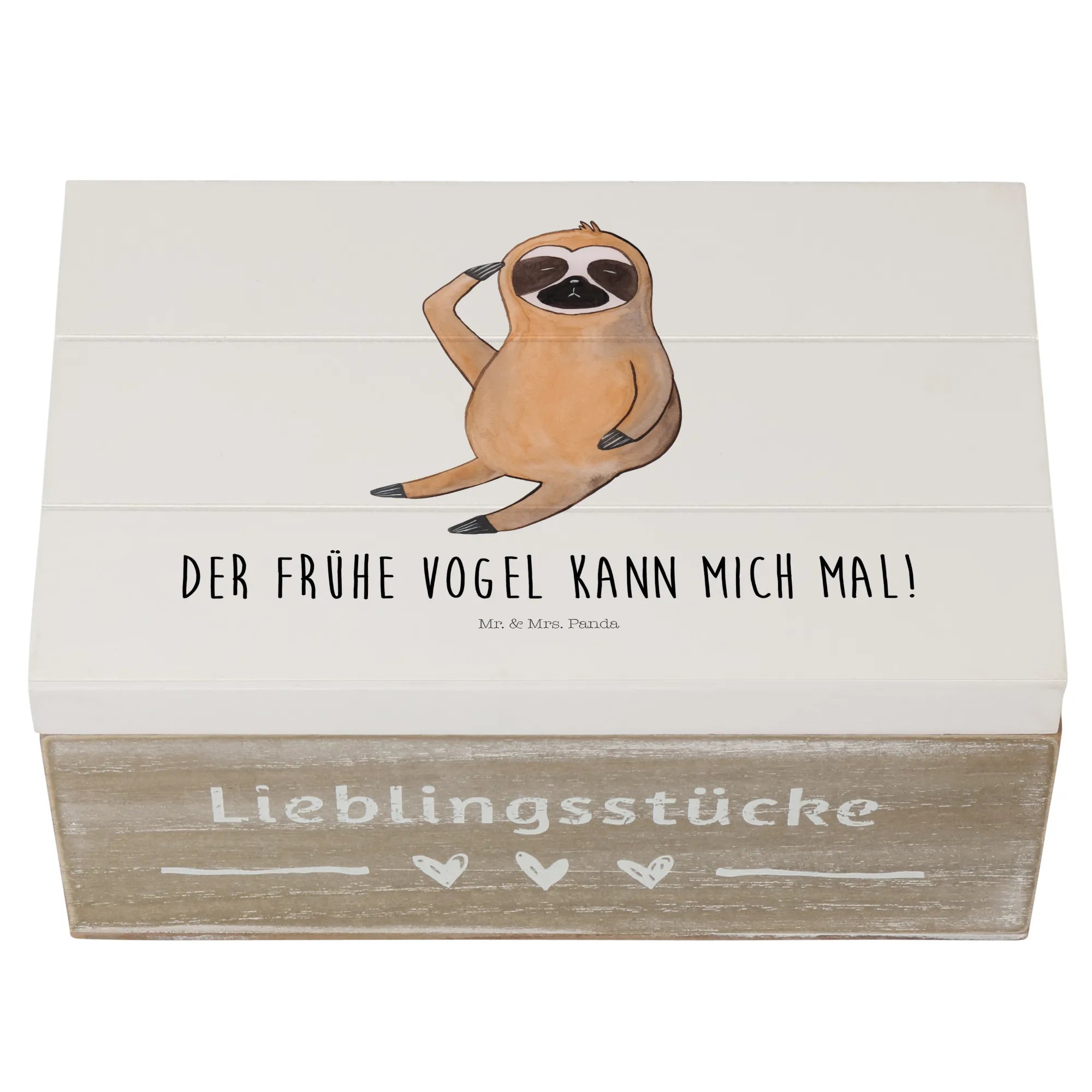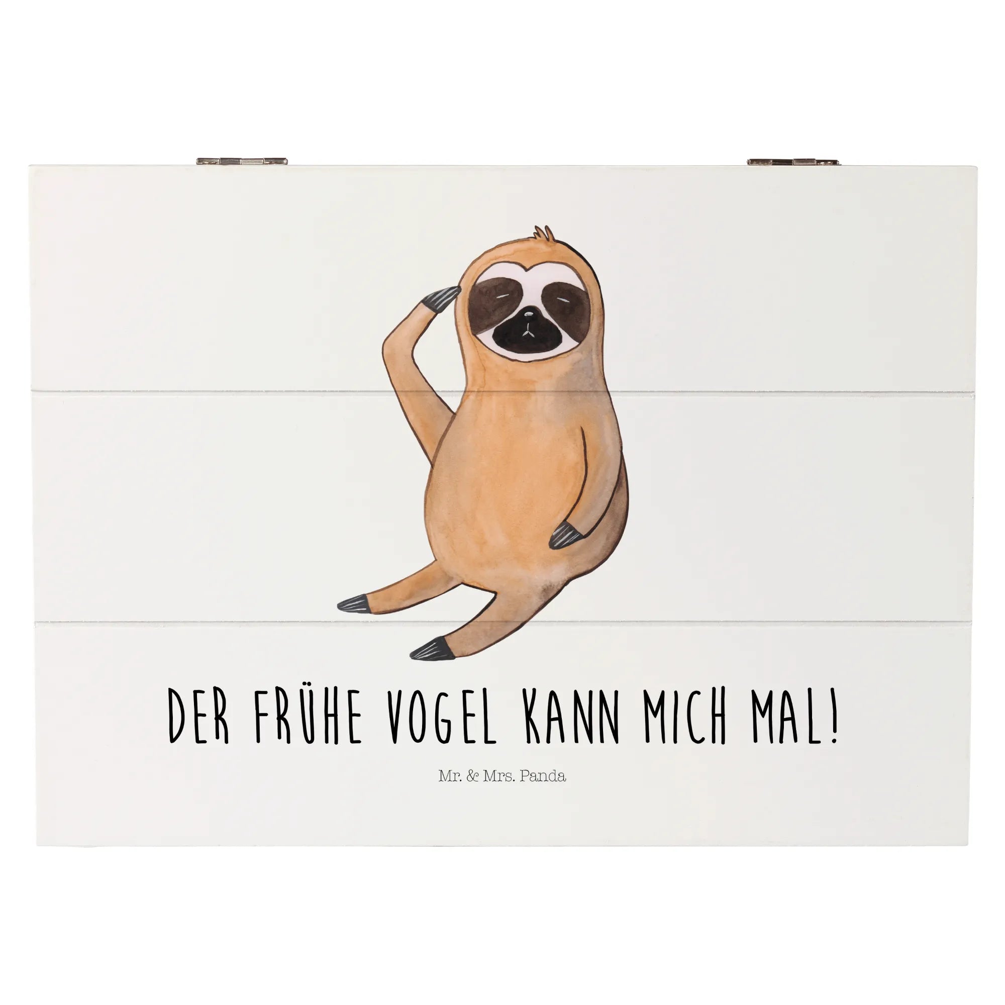 Diese zauberhafte Holzkiste ist mehr als eine Aufbewahrungsbox – sie ist eine Erinnerungskiste mit Charakter. Das niedliche Faultier-Motiv aus der Faultier - Kollektion wurde liebevoll von Mrs. Panda handgezeichnet. Ergänzt wird das Motiv durch den frechen Spruch „Der frühe Vogel kann mich mal!“, der perfekt zu Morgenmuffeln und allen Faultier-Liebhabern passt.