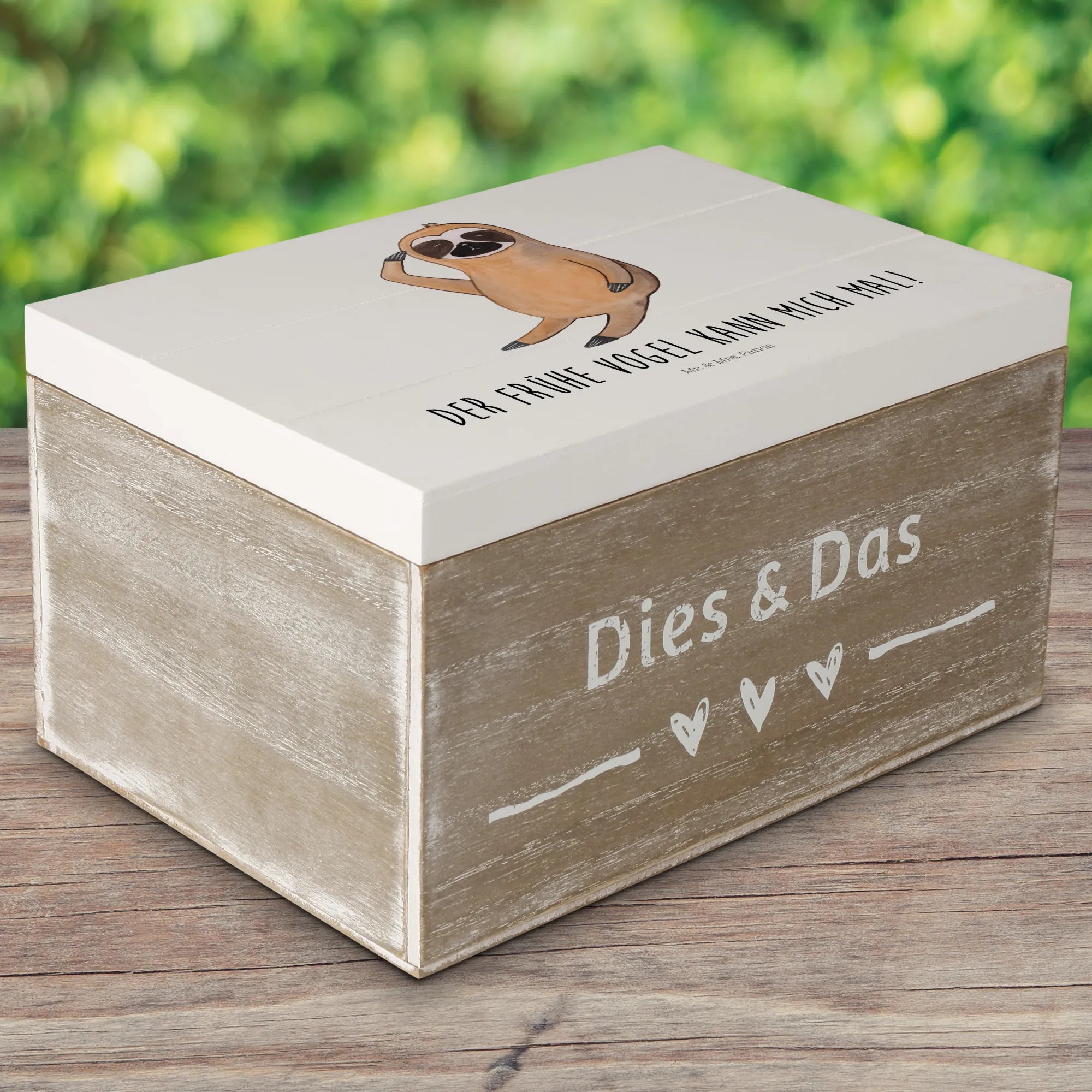 Bist du auf der Suche nach dem perfekten Geschenk für einen Faultier-Liebhaber? Dann ist die wunderschöne Holzkiste mit dem Motive 'Faultier Vogel zeigen' aus der Faultier-Kollektion von Mr. & Mrs. Panda einfach ideal!