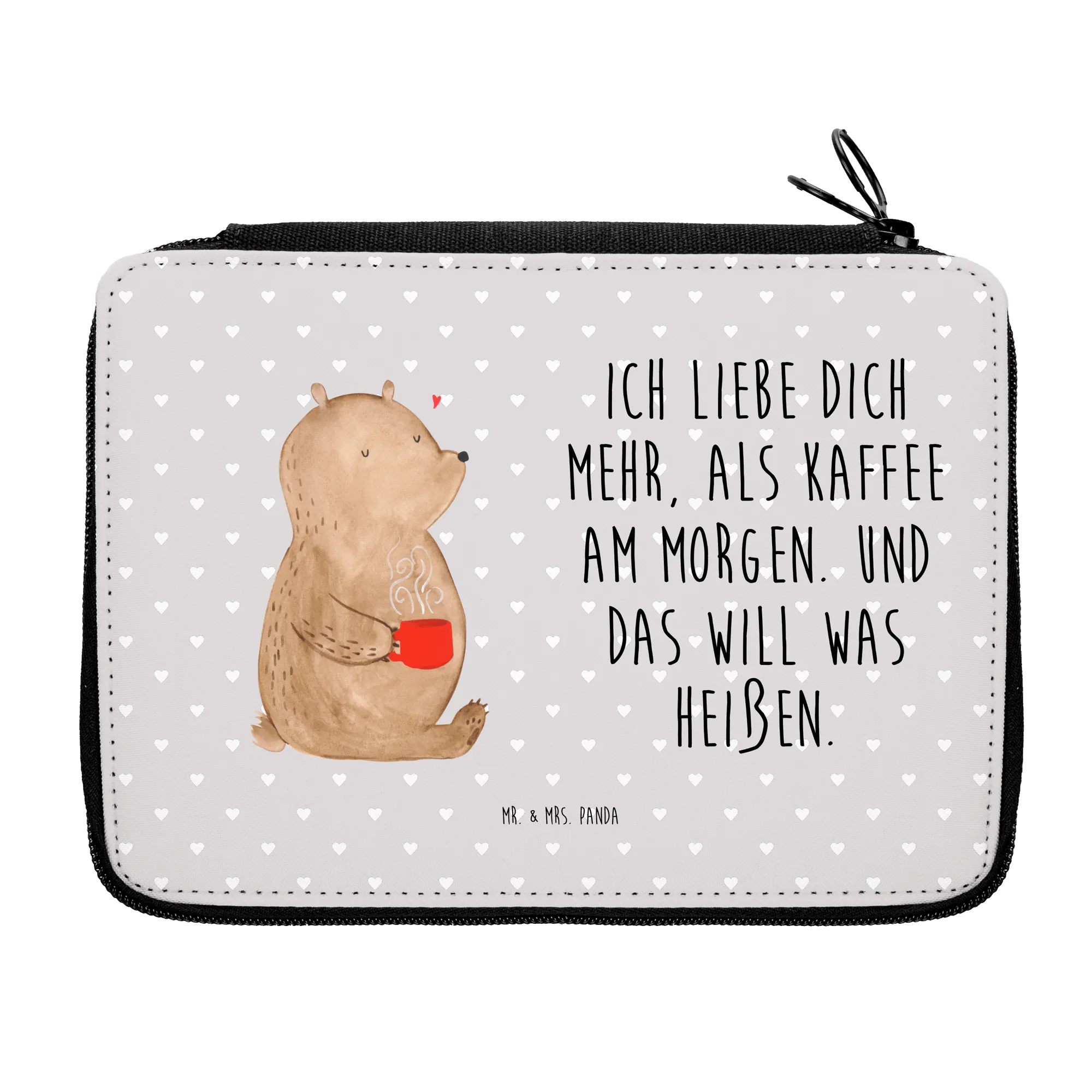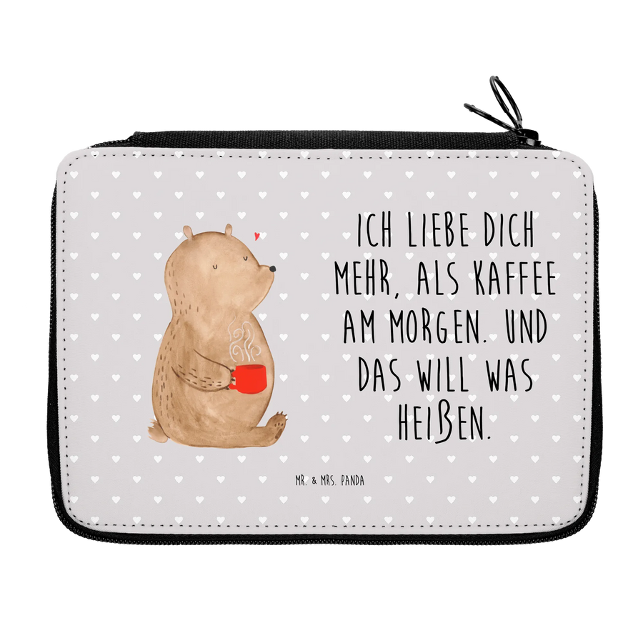 Die wunderschöne Federmappe von Mr. & Mrs. Panda ist das perfekte Geschenk für alle Schulanfänger und Grundschüler! Mit ihrem süßen Motiv des Bären Morgenkaffee zieht sie garantiert alle Blicke auf sich. Der zufriedene Bär hält einen roten Becher mit dampfendem Getränk in seinen Pfoten, während ein kleines Herz über ihm schwebt.