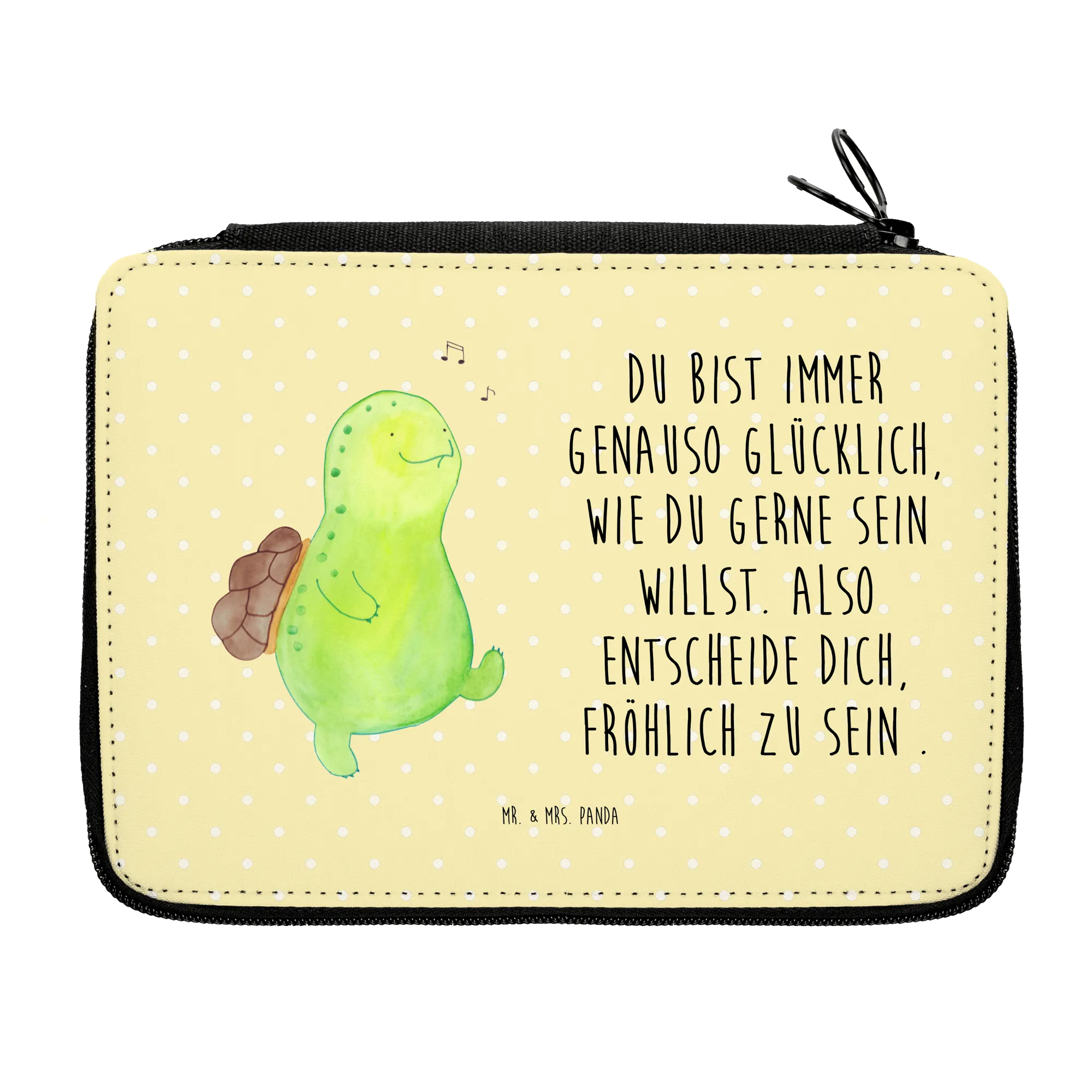 Die freundliche Federmappe mit dem fröhlichen Schildkrötenmotiv ist der perfekte Begleiter für jeden Grundschüler! Das Design 'Schildkröte pfeift' von Mr. & Mrs. Panda bringt ein Lächeln in jede Schultasche. Mit einem positiven Slogan, der besagt: 'Du bist immer genauso glücklich, wie du gerne sein willst. Also entscheide dich, fröhlich zu sein', motiviert diese Federmappe Kinder, den Schulalltag mit Freude und Lebensfreude zu meistern.