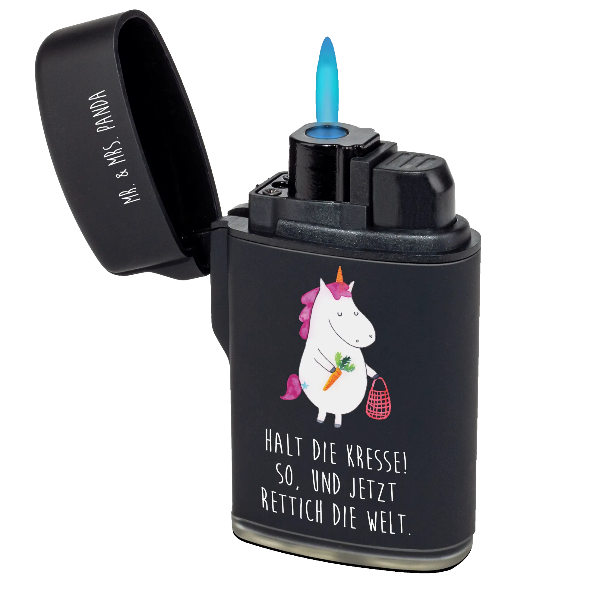 Das Mr. & Mrs. Panda Feuerzeug mit dem zauberhaften Einhorn Gemüse-Motiv ist das perfekte Geschenk für alle Einhorn-Liebhaber und Genussfreunde! Mit seinem liebevoll gestalteten Design machst Du jedem eine Freude, der die süße Magie der Einhörner und die farbenfrohe Welt der gesunden Ernährung schätzt. Jedes Feuerzeug aus der Einhorn-Kollektion erzählt eine Geschichte und bringt ein Lächeln ins Gesicht. Der witzige Spruch "Halt die Kresse! So, und jetzt Rettich die Welt." sorgt für gute Laune und inspiriert dazu, das Leben mit einem Lächeln zu genießen.