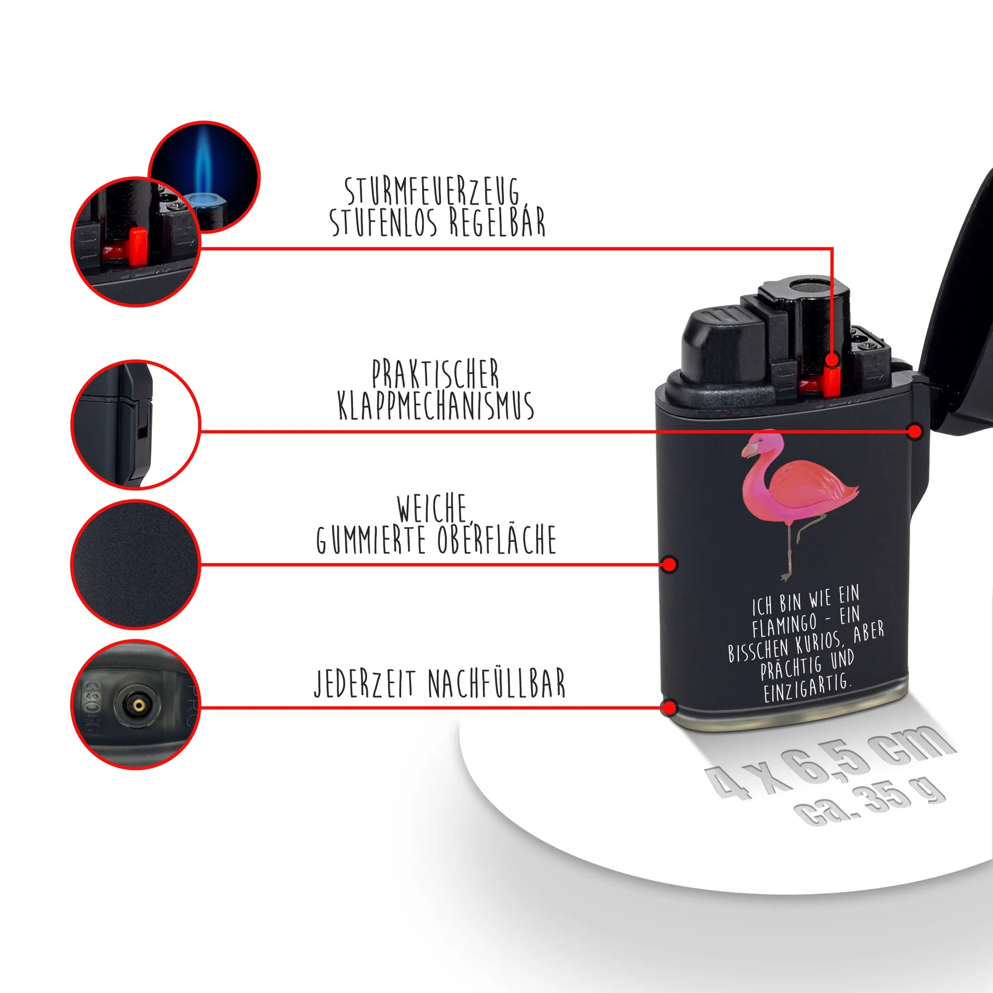 Dank des praktischen Klappmechanismus und der Nachfüllbarkeit ist dieses Sturmfeuerzeug nicht nur stylisch, sondern auch äußerst funktional! Die ideale Größe von 70 mm x 40 mm macht es perfekt für den Alltag - egal ob drinnen oder draußen, immer dabei und einsatzbereit. Die Flamingo Kollektion von Mr. & Mrs. Panda bietet viele weitere Produkte mit diesen bezaubernden Motiven, sodass Du ein ganzes Set für Dich oder als Geschenk für Deine Lieben zusammenstellen kannst.