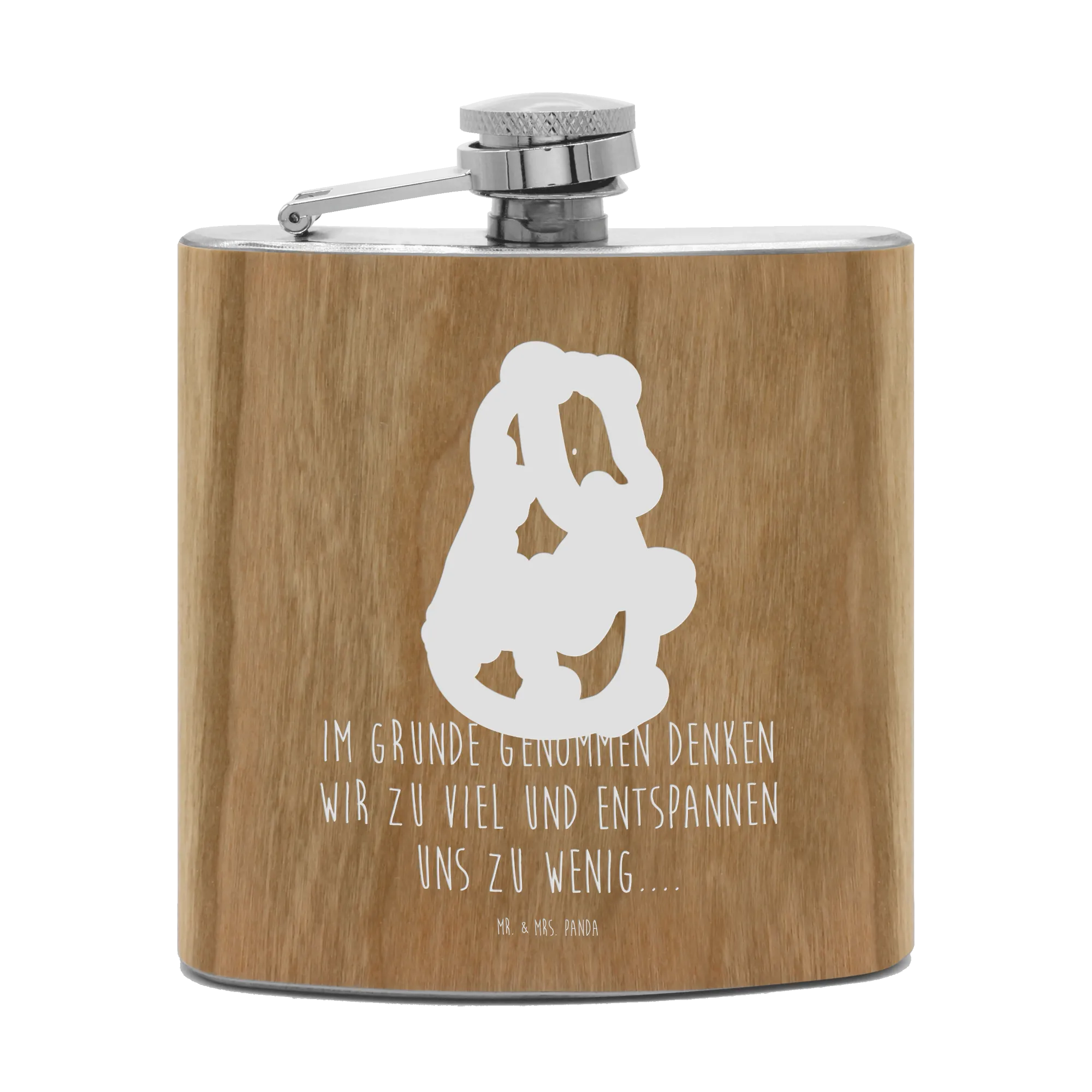Genieße deine Lieblingsgetränke stilvoll mit dem Flachmann von Mr. & Mrs. Panda. Mit den perfekten Abmessungen von 109 mm x 93 mm x 22 mm und einem Füllvolumen von 150 ml ist dieser Flachmann nicht nur praktisch, sondern auch ein echter Blickfang. Der Edelstahl, umhüllt mit Holzlaminat, gibt dem Flachmann eine besonders edle Note. Die humorvolle Gravur mit Motiven, die Freude bereiten, macht ihn zum idealen Begleiter für Junggesellenabschiede, Wandertouren oder entspannte Ausflüge mit Freunden. Super leicht und ideal zu transportieren, passt er in jede Tasche. Der Flachmann liegt gut in der Hand und ist mit einem sicheren Schraubverschluss ausgestattet, der ein Auslaufen verhindert. Achte darauf, ihn nur mit heißem Wasser zu reinigen, denn er ist nicht spülmaschinenfest!
