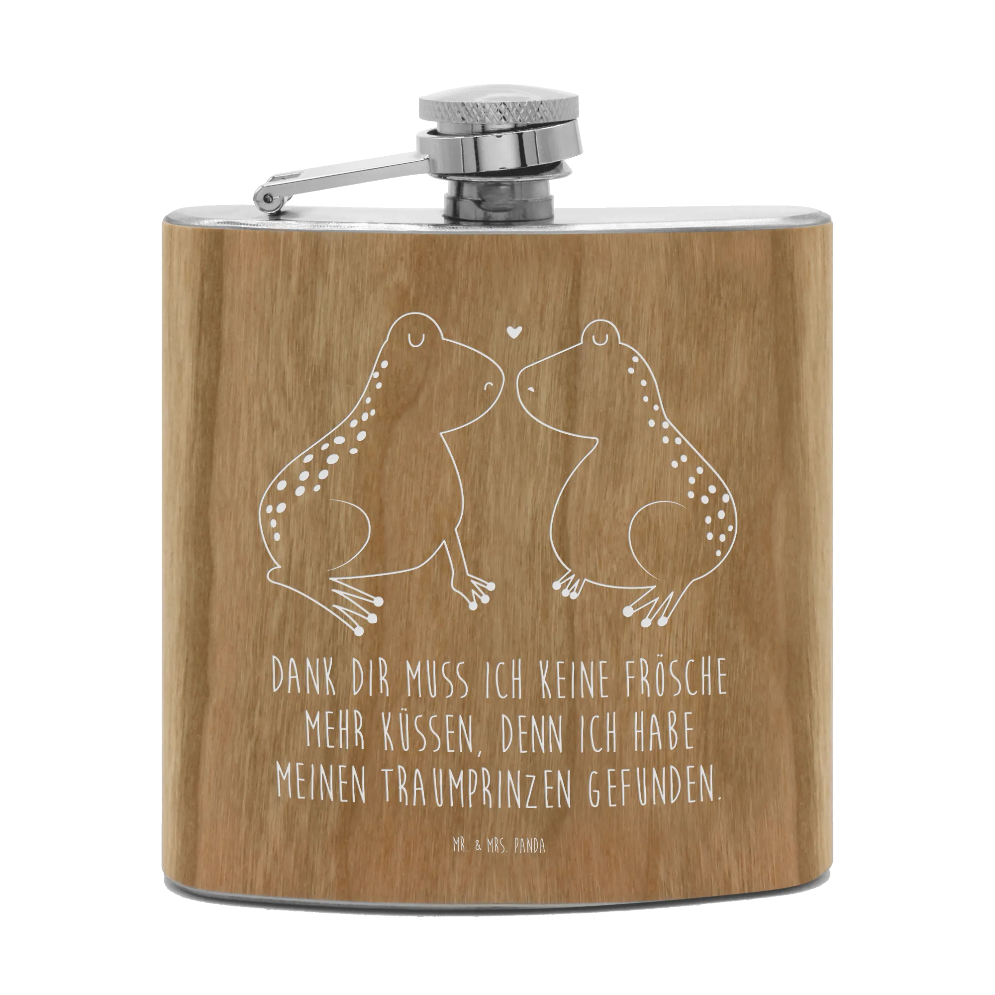 Das süße Design mit dem Motiv der verliebten Frösche ist nicht nur niedlich, sondern trägt auch eine bedeutungsvolle Botschaft. Zwischen den beiden Fröschen, die sich liebevoll gegenüberstehen, schwebt ein rotes Herz – ein Symbol für die Liebe und Verbundenheit. Der Spruch "Dank dir muss ich keine Frösche mehr Küssen, denn ich habe meinen Traumprinzen gefunden" ergänzt das Motiv auf charmante Weise und macht den Flachmann zu einem unvergesslichen Liebesbeweis.
