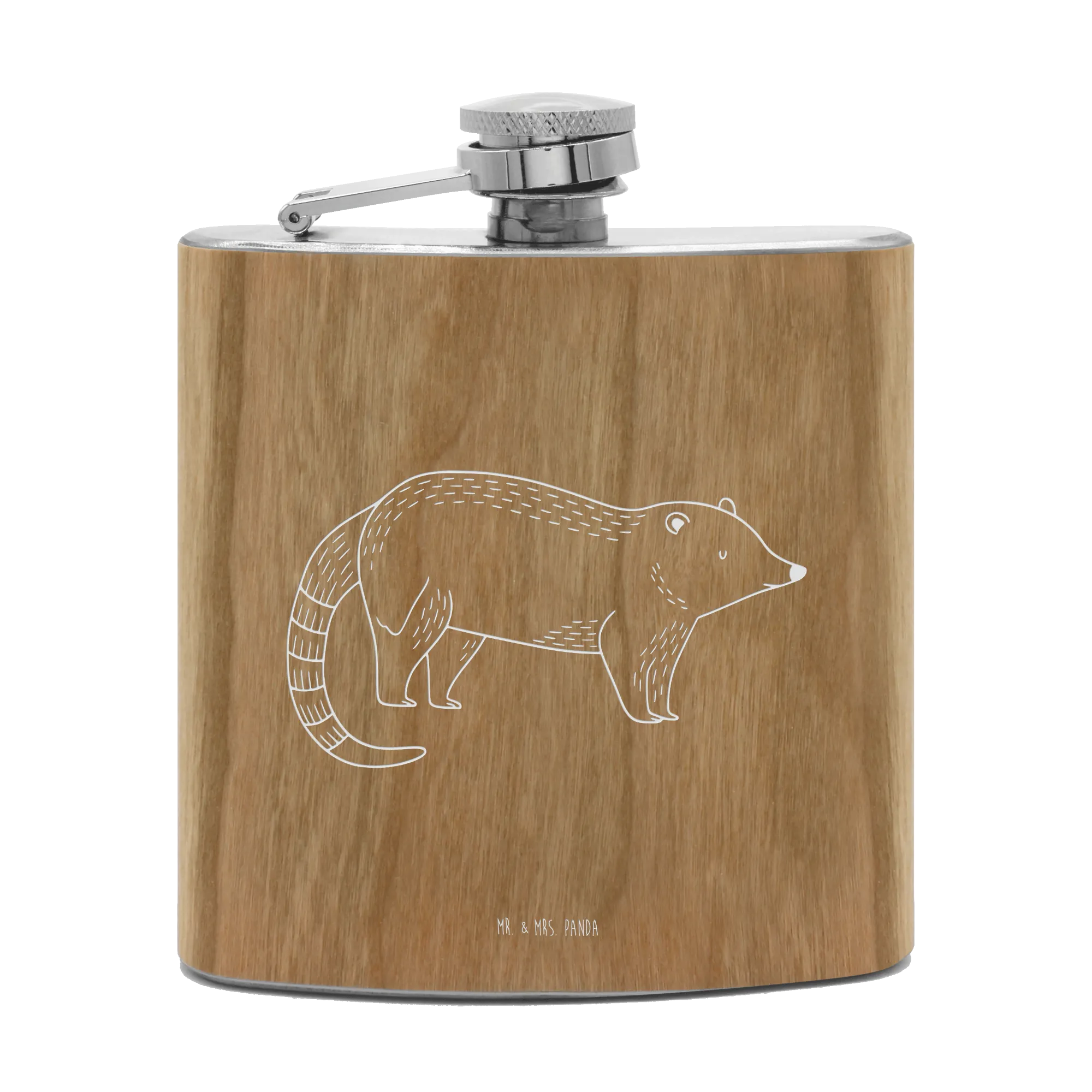 Was gibt es besseres, als einen kleinen Flachmann von Mr. & Mrs. Panda in deiner Tasche zu haben? Mit den Maßen von 109 mm x 93 mm x 22 mm und einem Füllvolumen von 150 ml umfasst er die perfekte Menge, um mit Freunden unterwegs anzustoßen! Hergestellt aus solidem Edelstahl und ummantelt mit stilvollem Holzlaminat, bietet dieser Flachmann eine edle Optik und ein angenehmes Tragegefühl. Die liebevolle Gravur mit spritzigen Sprüchen und niedlichen Motiven sorgt für gute Laune bei jedem Fest. Ob beim Junggesellenabschied oder beim Wandern, dieser Flachmann ist immer ein praktischer Begleiter. Mit dem sicheren Schraubverschluss bleibt alles dicht und er ist leicht zu reinigen - einfach mit heißem Wasser! Bitte beachte, dass er nicht spülmaschinenfest ist.