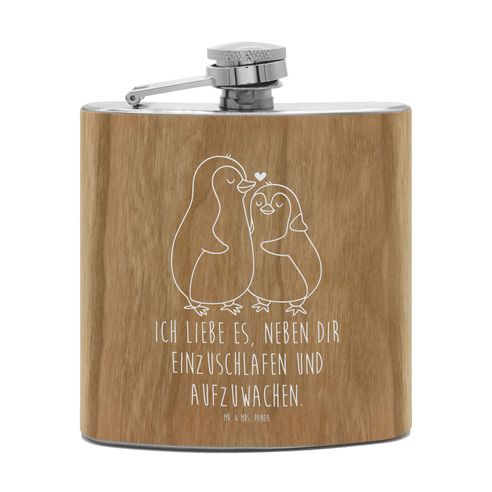 Der Flachmann von Mr. & Mrs. Panda ist das perfekte Accessoire für alle, die gerne unterwegs sind. Er hat kompakte Maße von 109 mm x 93 mm x 22 mm und ein Füllvolumen von 150 ml. Hergestellt aus robustem Edelstahl und ummantelt mit schönem Holzlaminat, ist dieser Flachmann nicht nur funktional, sondern auch ein echter Hingucker. Die exquisite Gravur mit humorvollen Sprüchen und süßen Motiven macht ihn zu einem besonderen Geschenk. Ob für einen Junggesellenabschied, beim Wandern oder einfach nur zum Feiern mit Freunden, dieser Flachmann ist superleicht und lässt sich leicht transportieren. Er liegt angenehm in der Hand und ist zudem mit einem sicheren Schraubverschluss ausgestattet, sodass du dir keine Sorgen um Auslaufen machen musst. Pflege ihn einfach mit heißem Wasser, um die Qualität zu erhalten, denn er ist nicht spülmaschinenfest!