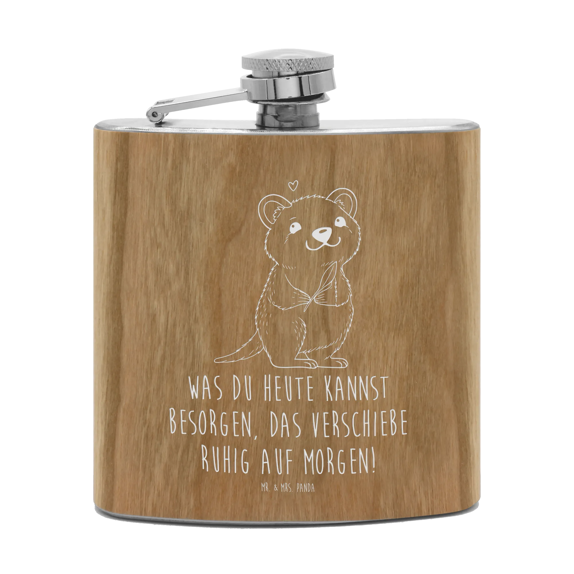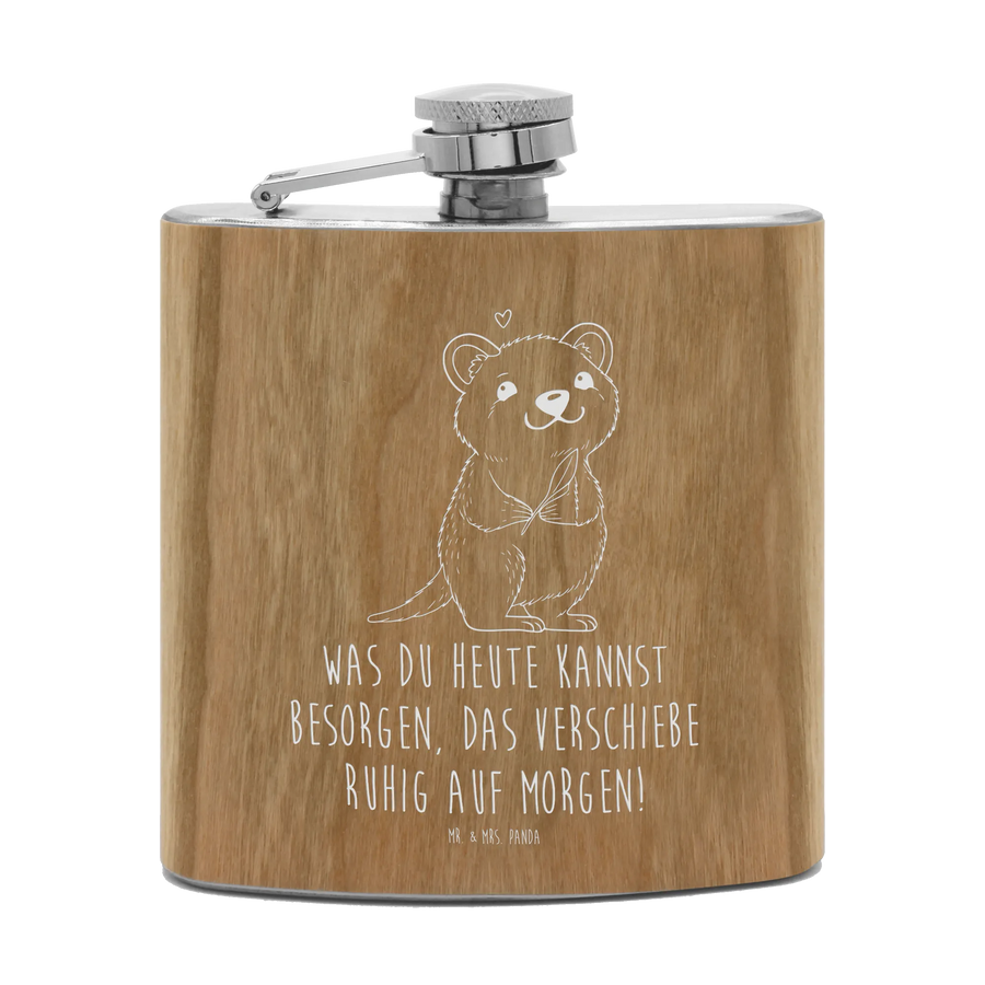 Genieße deine Lieblingsgetränke stilvoll mit dem Flachmann von Mr. & Mrs. Panda. Mit den perfekten Abmessungen von 109 mm x 93 mm x 22 mm und einem Füllvolumen von 150 ml ist dieser Flachmann nicht nur praktisch, sondern auch ein echter Blickfang. Der Edelstahl, umhüllt mit Holzlaminat, gibt dem Flachmann eine besonders edle Note. Die humorvolle Gravur mit Motiven, die Freude bereiten, macht ihn zum idealen Begleiter für Junggesellenabschiede, Wandertouren oder entspannte Ausflüge mit Freunden. Super leicht und ideal zu transportieren, passt er in jede Tasche. Der Flachmann liegt gut in der Hand und ist mit einem sicheren Schraubverschluss ausgestattet, der ein Auslaufen verhindert. Achte darauf, ihn nur mit heißem Wasser zu reinigen, denn er ist nicht spülmaschinenfest!