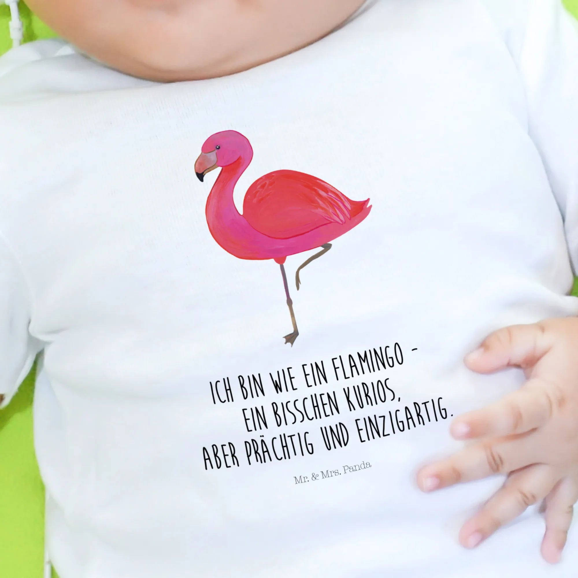 Mit viel Liebe von Mrs. Panda handgezeichnet, verzaubert der pinke Flamingo die Herzen aller Eltern und Freunde. Der Spruch auf dem Shirt "Ich bin wie ein Flamingo - ein bisschen kurios, aber prächtig und einzigartig" strahlt Selbstliebe und Stolz aus und eignet sich ausgezeichnet für Babys, die gerade in die aufregende Welt der Farben und Formen eintauchen.