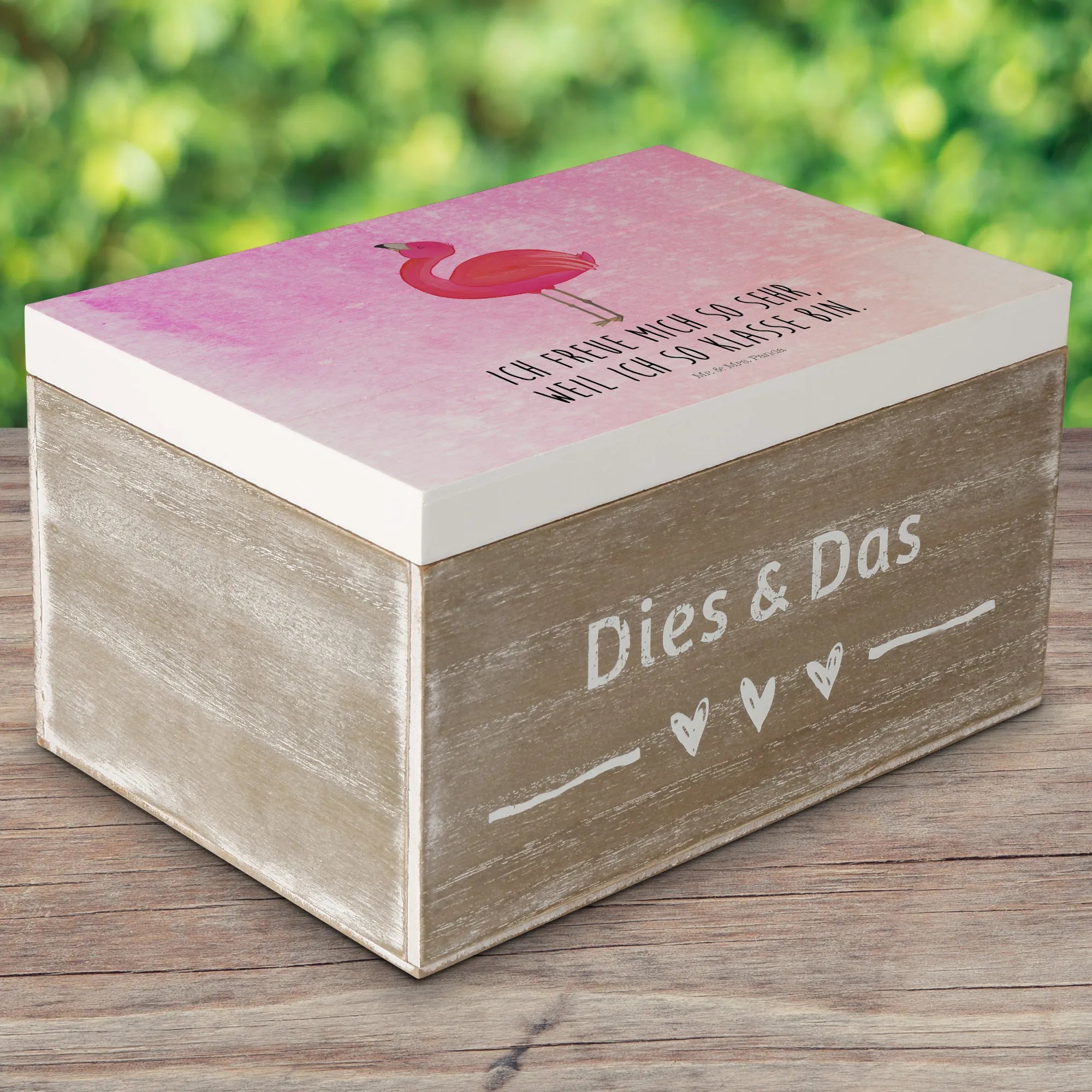 Die Holzkiste "Flamingo stolz" aus der einzigartigen Flamingo-Kollektion von Mr. & Mrs. Panda ist das perfekte Geschenk für all diejenigen, die Selbstliebe und Freude schätzen. Diese wunderschöne Kiste besteht aus robustem, wasserabweisendem Material und bietet genügend Platz für all deine wertvollen Erinnerungen.