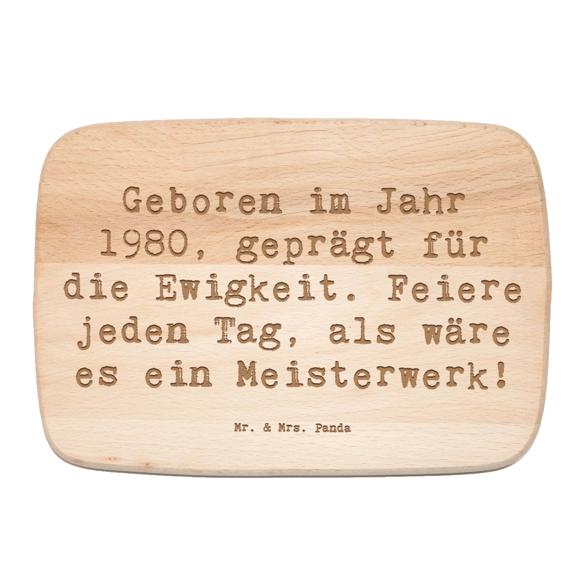 Die süßen Aquarell-Illustrationen von Mrs. Panda und die langlebige Lasergravur machen jedes Stück zu einem Unikat. Mit der Aufschrift "Geboren im Jahr 1980, geprägt für die Ewigkeit. Feiere jeden Tag, als wäre es ein Meisterwerk!" bringt dieses Frühstücksbrett ein Lächeln auf jedes Gesicht und ist ideal als Geburtstagsgeschenk.