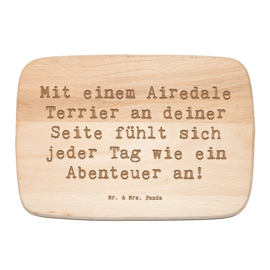 Mit einem Maß von 130 mm x 230 mm passt es perfekt in jede Küche. Die besonders langlebige Lasergravur sorgt dafür, dass der Spruch 'Mit einem Airedale Terrier an deiner Seite fühlt sich jeder Tag wie ein Abenteuer an!' immer gut lesbar bleibt.