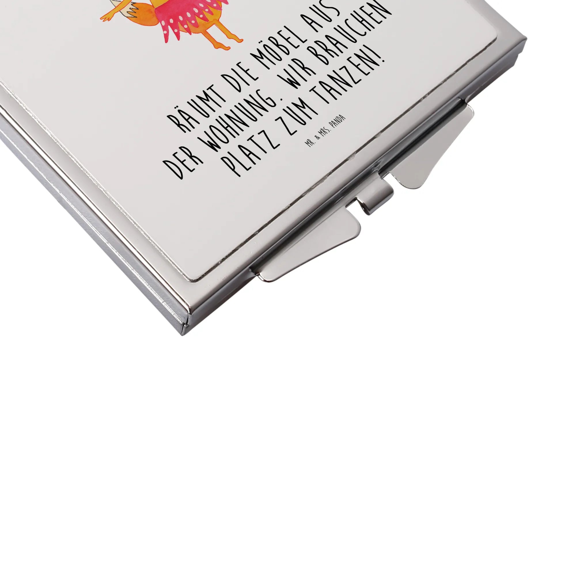 Der Spruch 'Räumt die Möbel aus der Wohnung. Wir brauchen Platz zum Tanzen!' bringt ein Lächeln aufs Gesicht und motiviert uns, die Freude am Tanzen zu leben. Die quadratische Form von 60 mm x 60 mm passt perfekt in jede Tasche und ist somit immer griffbereit. Pflege außerdem deinen Handtaschenspiegel ganz einfach mit einem feuchten Tuch, damit du immer den besten Blick auf dich hast!