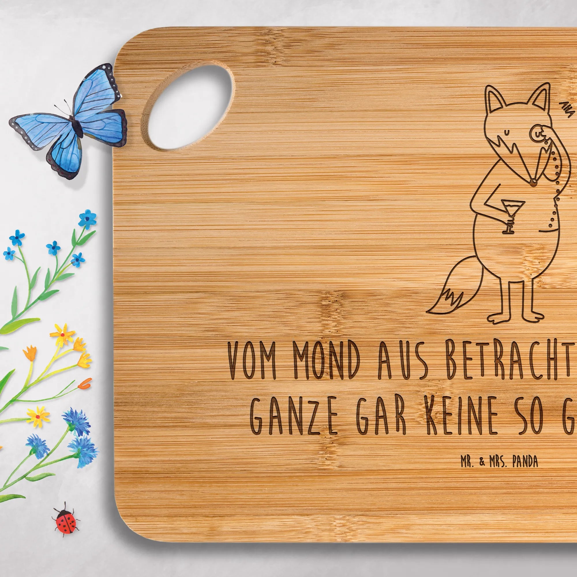 Unser Holzschneidebrett ist nicht nur praktisch, sondern erzählt eine kleine Geschichte: Ein stattlicher, niedlicher Fuchs mit Monokel blickt dich an, begleitet von dem tröstenden Spruch „Vom Mond aus betrachtet spielt das Ganze gar keine so große Rolle.“ Dieses Frühstücksbrettchen zaubert beim Frühstück, beim Vesper oder beim Käseabend ein Lächeln auf die Lippen und ist ein wunderbares Geschenk für viele Gelegenheiten.