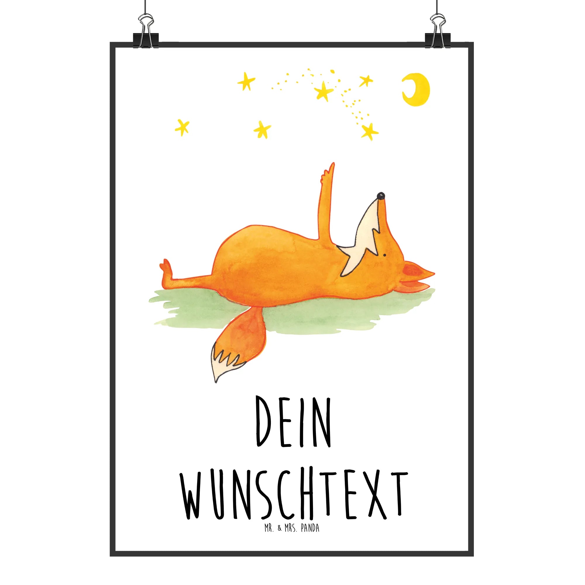 Das personalisierte Poster "Fuchs Sterne" von Mr. & Mrs. Panda ist der ideale Begleiter für Träumer und Sternengucker. Mit diesem bezaubernden Wandposter bringst du nicht nur Farbe in dein Zuhause, sondern auch eine Portion Liebe und Positivität. Der süße Fuchs, der entspannt auf dem Rücken liegt und in den Sternenhimmel schaut, vermittelt eine wohlige Atmosphäre.
