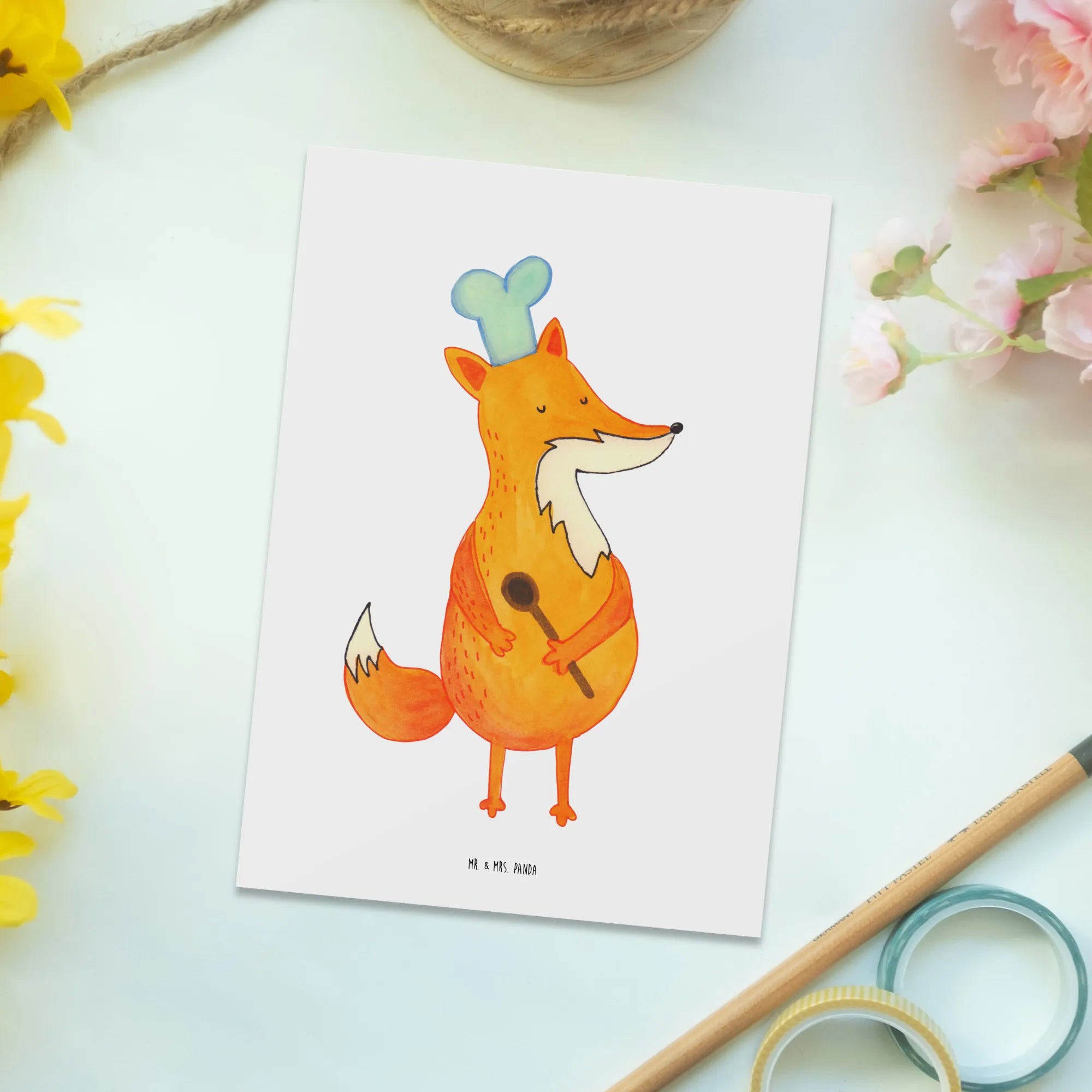 Die wunderschöne Postkarte "Fuchs Koch" von Mr. & Mrs. Panda ist das perfekte Geschenk für alle, die das Kochen lieben und eine besondere Deko in ihrer Küche schätzen. Der liebevolle Fuchs, der bereitsteht, um seine Kochkünste mit dir zu teilen, wird nicht nur deine Gäste erfreuen, sondern auch jeden, der ein wenig Freude und Witz in sein Zuhause bringen möchte.