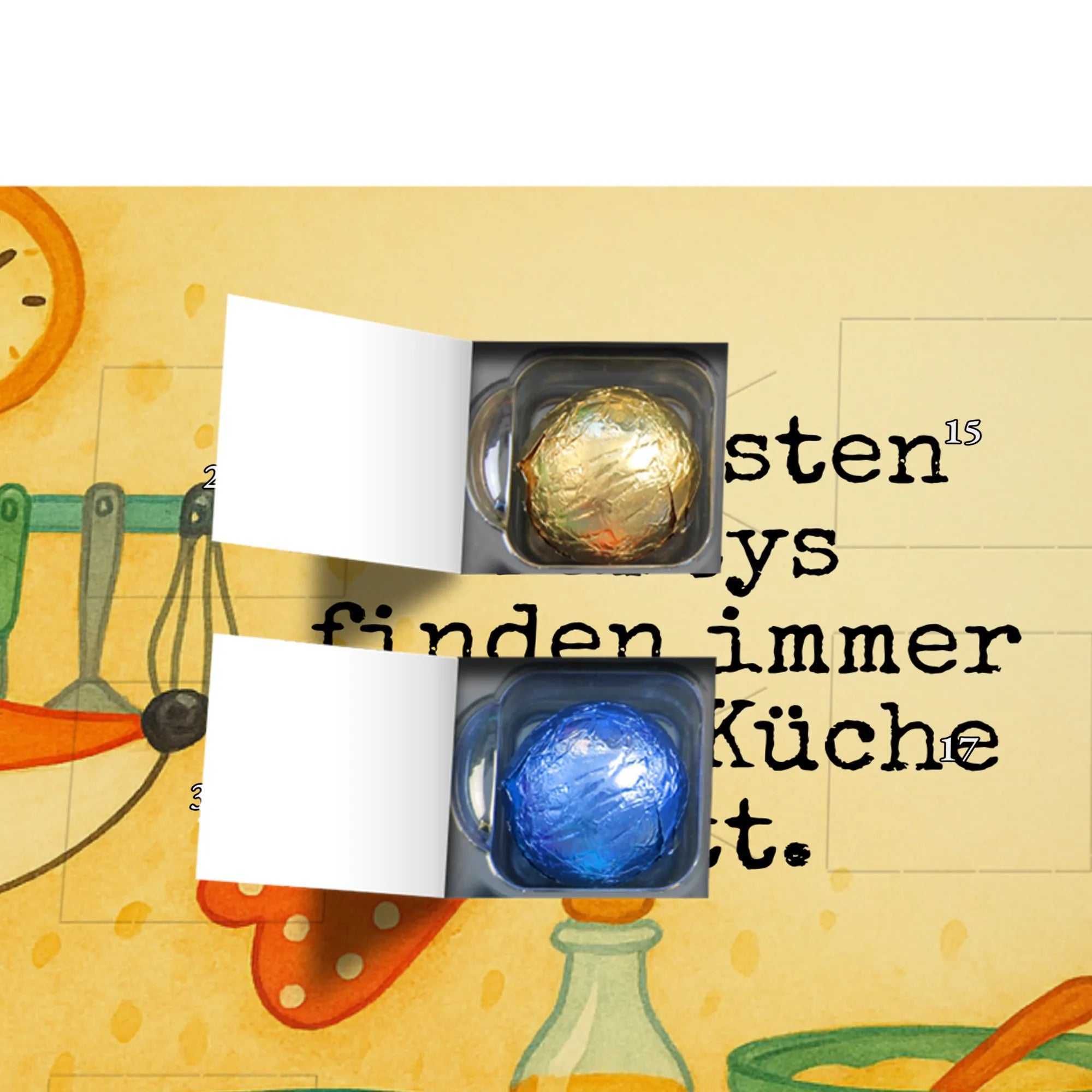 Wunderschöner Schokoladen-Adventskalender von Mr. & Mrs. Panda – süßes Design trifft hochwertige Verarbeitung. Unser Schokoladen-Adventskalender ist bedruckt mit wunderschönen Motiven & Sprüchen von Mr. & Mrs. Panda und nicht personalisierbar, dafür aber mit liebevollen Details gestaltet. Die brillante Druckqualität mit seidenmatter Oberflächenveredelung verleiht dem Kalender ein edles Finish, und auch die Seitenflächen sind bedruckt für einen rundum stimmigen Look. Maße: 233 mm x 178 mm x 24 mm. Die Konstruktion erlaubt sowohl das Aufstellen als auch das Aufhängen – Besonderheit: kann aufgehängt oder aufgestellt werden. Gefüllt mit MARKENNAMEN Schokolade und mit leckeren Schokoladenkugeln bestückt, ist jeder Dezembertag eine kleine Belohnung. Bitte lies die besonderen Hinweise: (Kann Spuren von Haselnüssen, Mandeln, Gluten und Soja enthalten!), kühl und trocken lagern. Ideal als Geschenk, Adventsdekoration oder süße Überraschung für Freunde und Familie. Mr. & Mrs. Panda wünscht dir eine gemütliche und genussvolle Adventszeit!