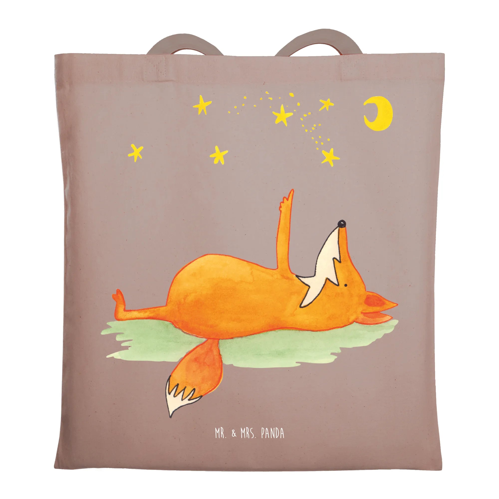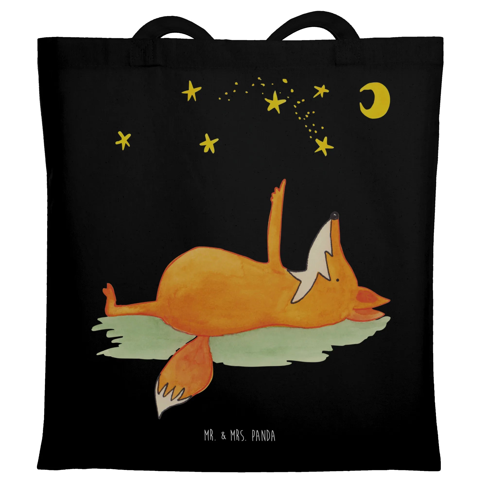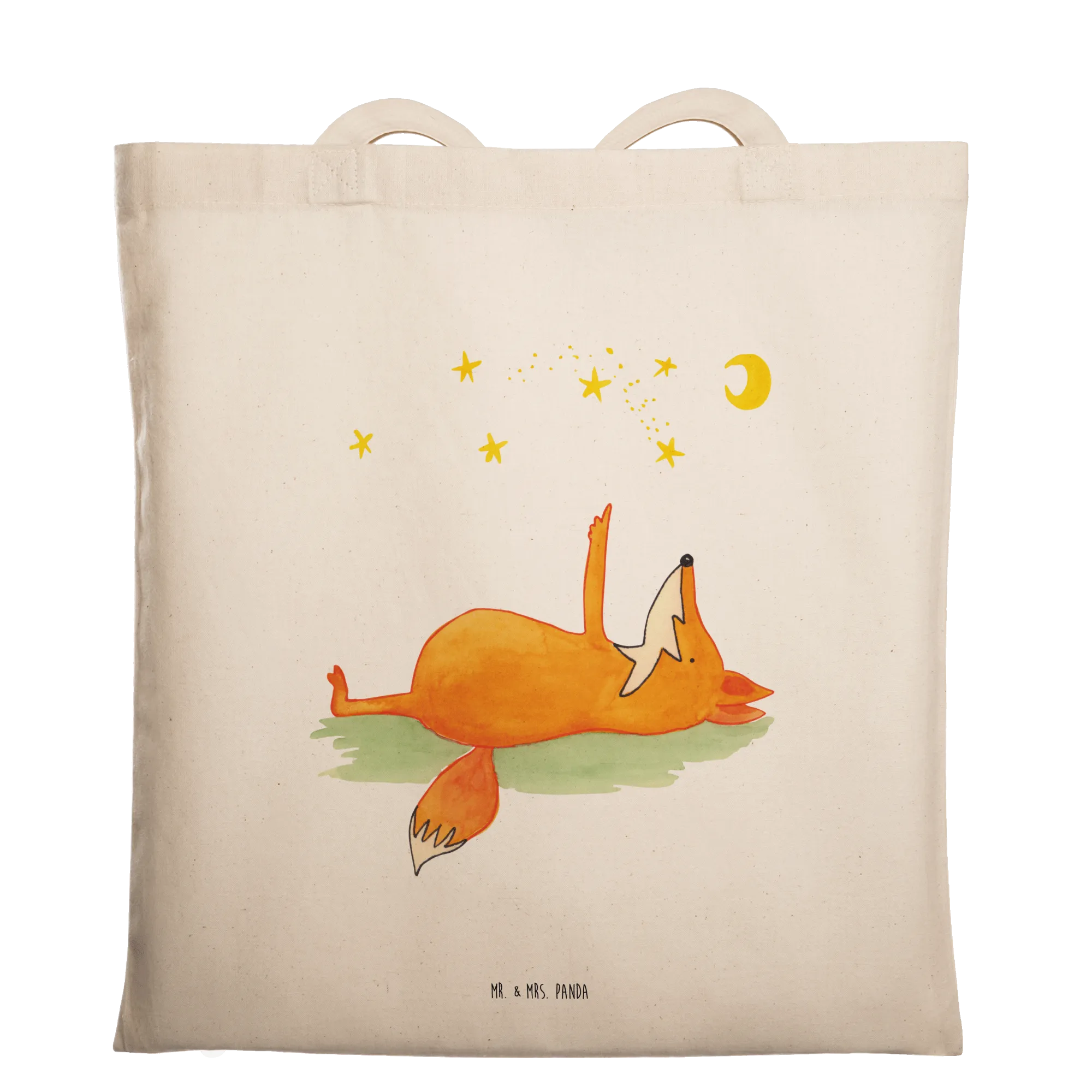 Die Tragetasche "Fuchs Sterne" von Mr. & Mrs. Panda ist das perfekte Accessoire für alle, die die Sterne lieben und täglich Freude verbreiten möchten. Hochwertig aus 100% Baumwolle gefertigt, vereint diese liebevoll gestaltete Tasche Funktionalität und Stil. Mit einem süßen Fuchs, der auf dem Rücken liegt und den Sternen zuschaut, bringt das Design Freude in deinen Alltag. Der Slogan "Always look on the bright side of life" erinnert dich daran, stets positiv zu bleiben, ganz gleich, was kommt.