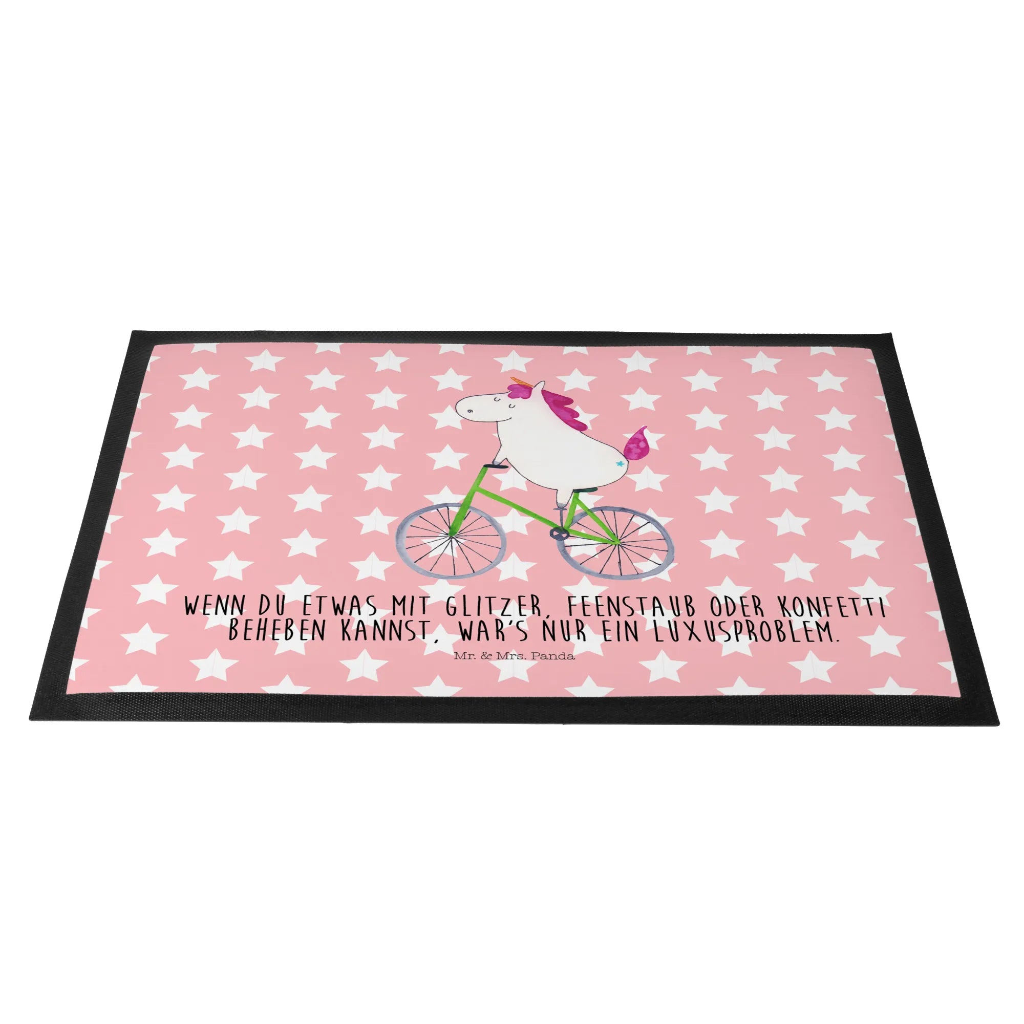 Die Fußmatte "Einhorn Radfahrer" von Mr. & Mrs. Panda ist der perfekte Begleiter für dein Zuhause! Sie vereint Funktionalität und charmantes Design in einem. Mit einem liebevoll handgezeichneten Motiv eines Einhorns, das glücklich mit dem Fahrrad fährt, bringt sie ein Lächeln in jeden Alltag.