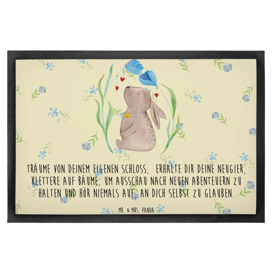 Die Fußmatte Hase Blume aus der Ostern-Kollektion von Mr. & Mrs. Panda ist das perfekte Geschenk für alle, die ihr Zuhause im Frühling oder zu Ostern mit einem fröhlichen Touch verschönern möchten. Mit einem niedlichen Hase, der zwischen bunten Blumen sitzt und einem Glöckchen um den Hals trägt, bringt diese Fußmatte gute Laune direkt ins Haus. Die liebevollen Motive der Ostern-Kollektion, einschließlich dieses charmanten Hasen, wurden mit viel Herz von Mrs. Panda handgezeichnet und inspirieren dazu, die verspielte und unbeschwerte Seite des Lebens zu zeigen.