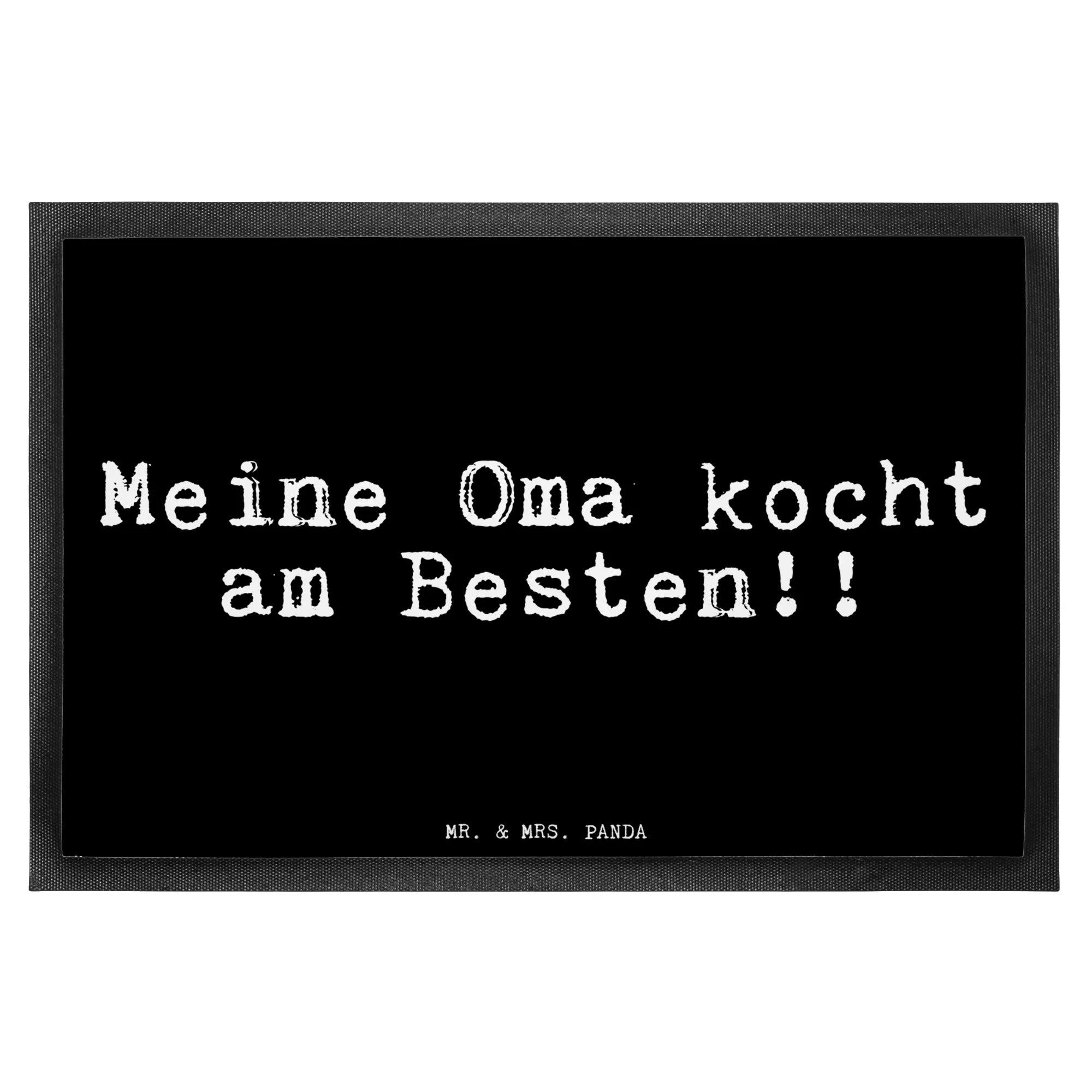 Die Fußmatte 'Meine Oma kocht am Besten!!' von Mr. & Mrs. Panda ist nicht nur ein praktischer Schmutzfänger, sondern auch ein herzlicher Gruß für jeden Besuch. Diese hochwertige Türmatte hat eine Vorderseite aus robustem Polyesterfilz, die nicht nur den Schmutz von den Schuhen fernhält, sondern auch langlebig und pflegeleicht ist. Der breite Gummirand sorgt dafür, dass die Matte sicher an ihrem Platz bleibt und verhindert das Ausfransen. Mit ihren Maßen von 40 x 60 cm passt sie perfekt vor jede Haustür und heißt Gäste mit einem liebevollen Spruch willkommen.