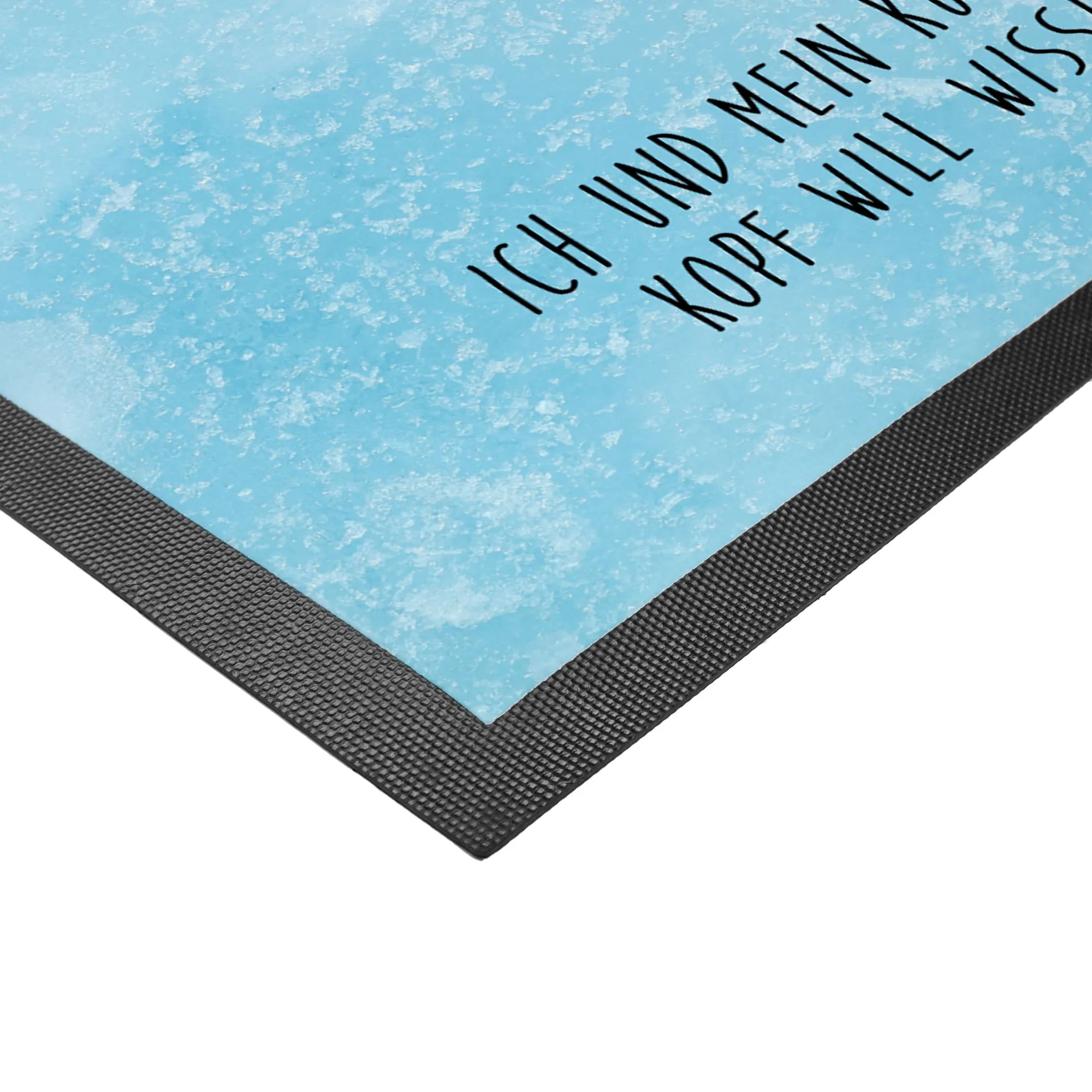 Die Kombination aus einem ansprechenden Motiv und einem humorvollen Slogan – "Ich und mein Körper wollen schlafen, aber mein Kopf will wissen, ob Pinguine Knie haben..." – macht diese Fußmatte zu einem echten Blickfang.