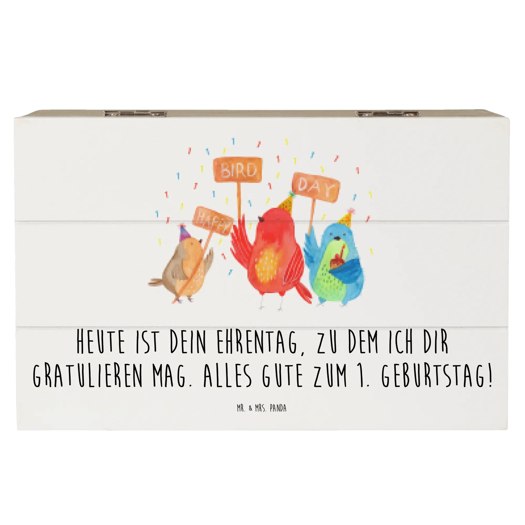 Die Holzkiste "1. Geburtstag Happy Bird Day" von Mr. & Mrs. Panda ist das perfekte Geschenk für den ersten Geburtstag! Diese wunderschöne Kiste ist nicht nur eine Aufbewahrungsbox für die Schätze des kleinen Geburtstagskindes, sondern auch eine zauberhafte Erinnerungskiste. Sie wurde liebevoll mit dem Motive von fröhlichen Vögeln entworfen, die feiern und gute Laune verbreiten. Der Spruch "Heute ist dein Ehrentag, zu dem ich dir gratulieren mag. Alles Gute zum 1. Geburtstag!" ist ein wunderschöner Begleiter zur Feier dieses besonderen Anlasses.