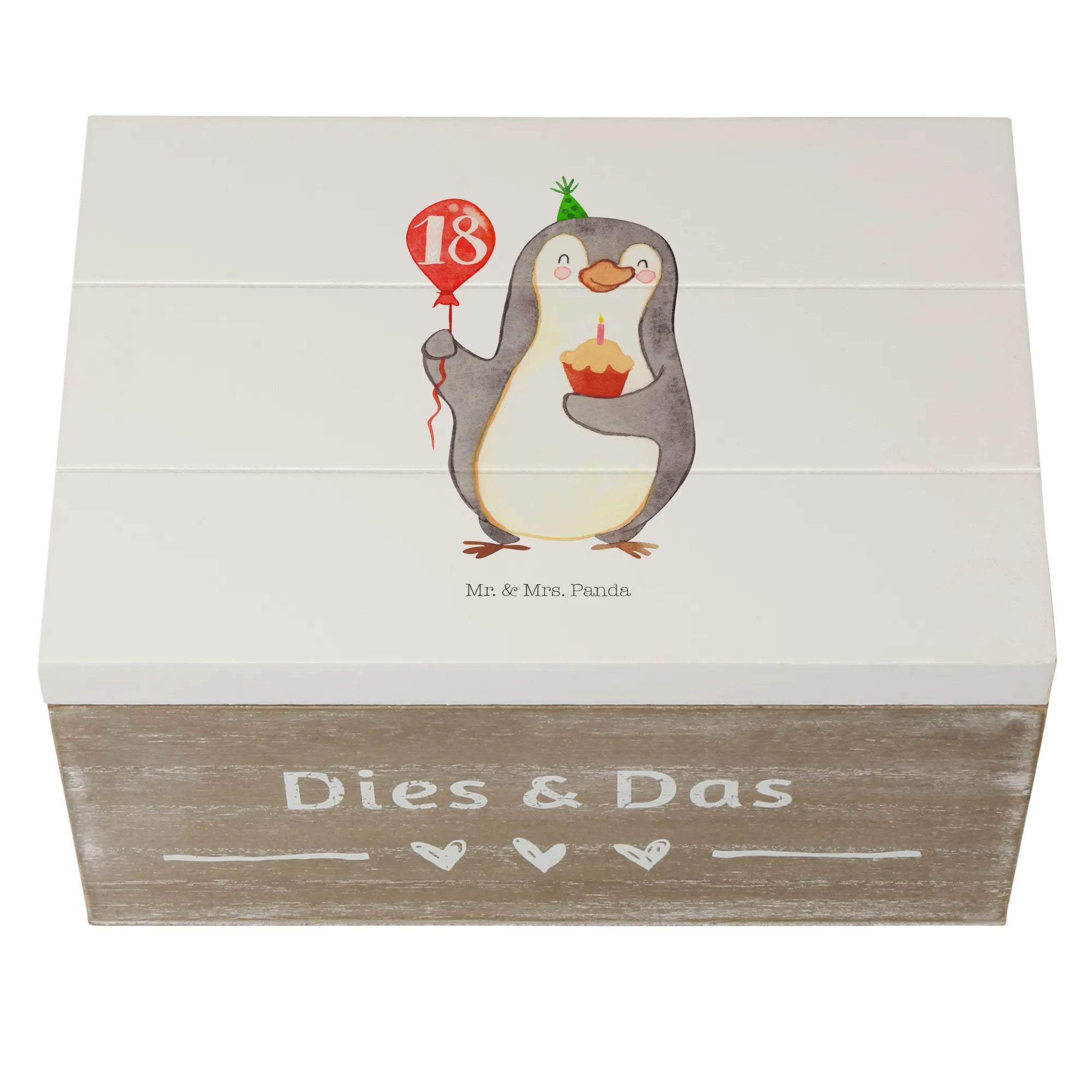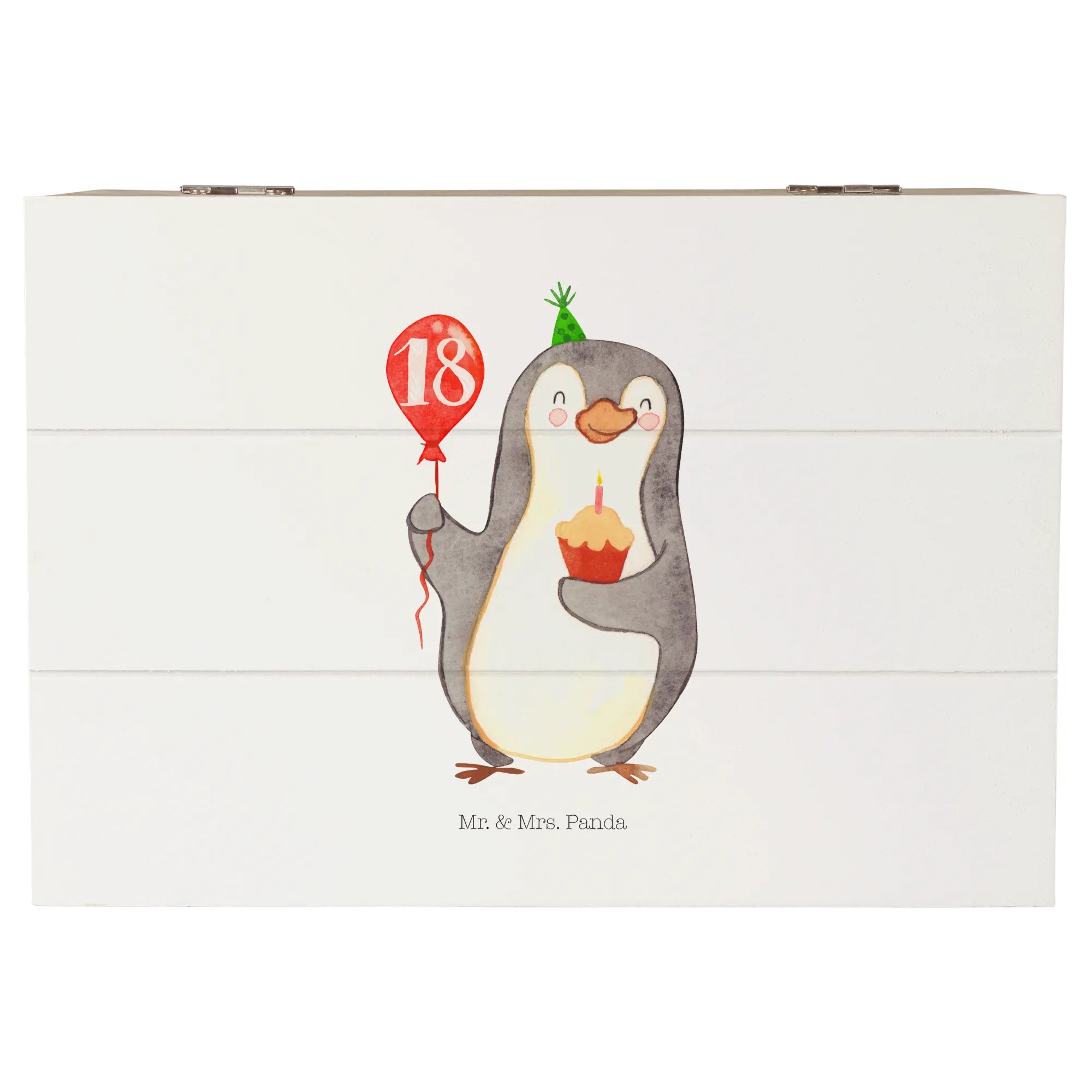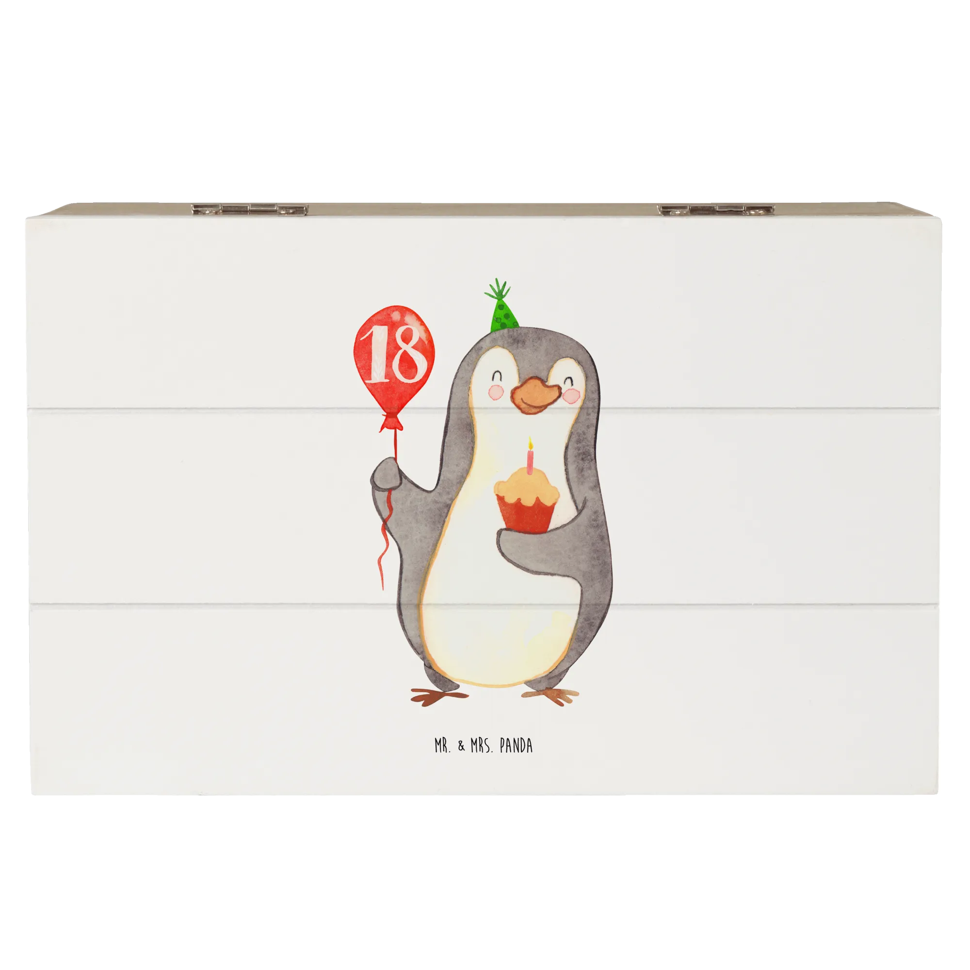 Entdecke die bezaubernde Holzkiste mit dem niedlichen Motiv des Pinguins mit Luftballon – die perfekte Geschenkbox zum 18. Geburtstag!