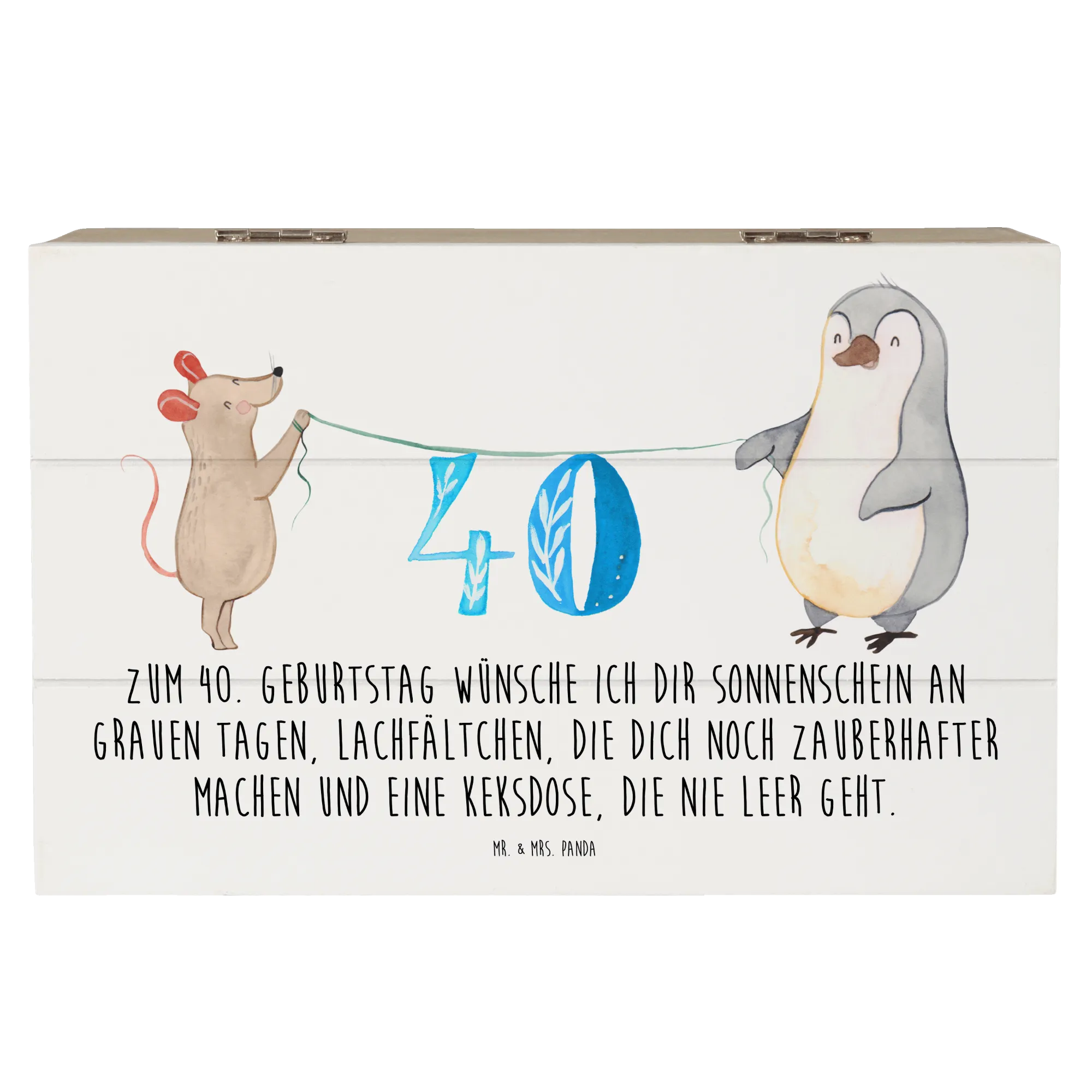 Entdecke die wundervolle Holzkiste zum 40. Geburtstag mit dem süßen Motiv Maus und Pinguin von Mr. & Mrs. Panda! Diese Erinnerungskiste ist nicht nur ein praktischer Aufbewahrungsort für die ganz besonderen Schätze, sondern auch ein liebevolles Geschenk für Freunde, Familie oder Dich selbst.