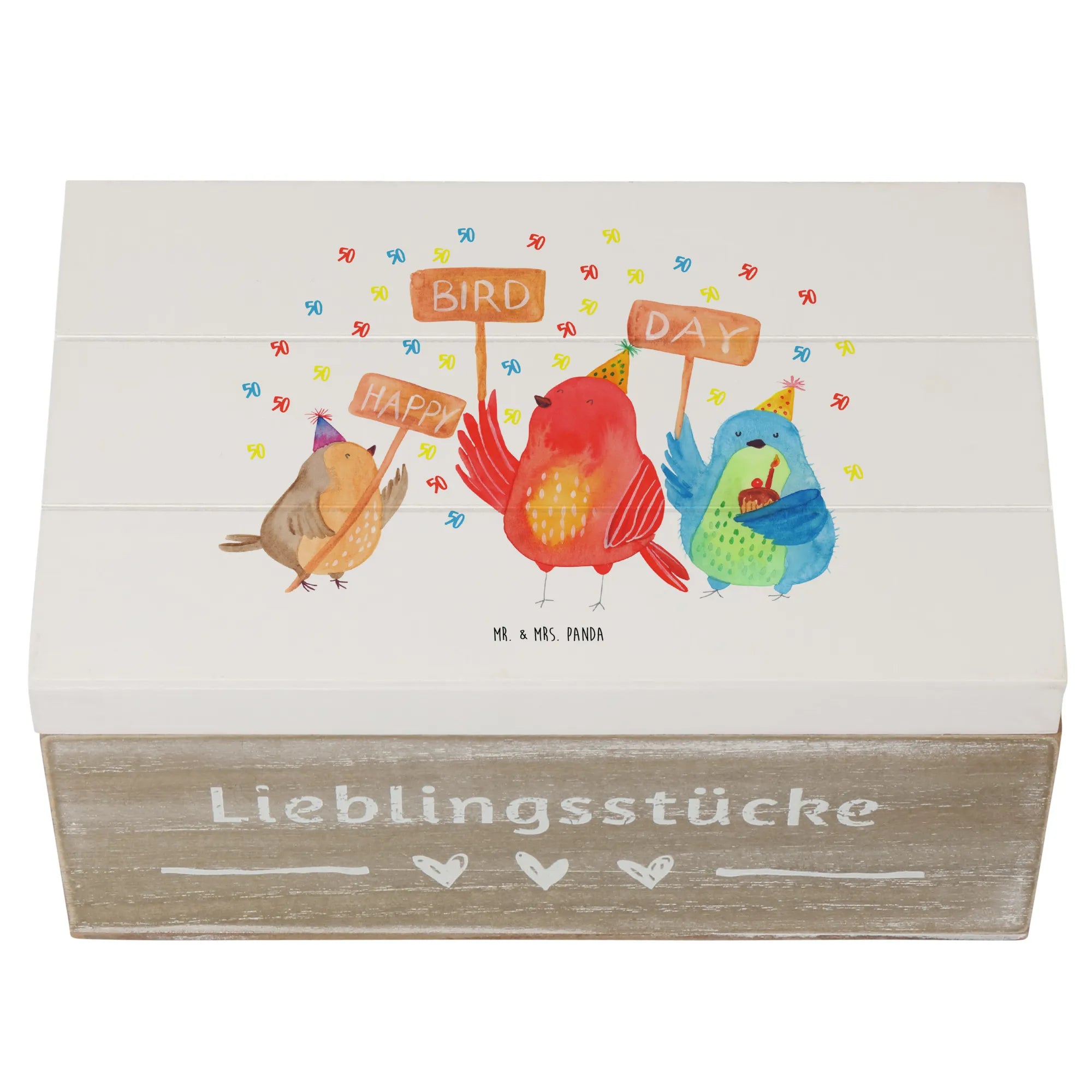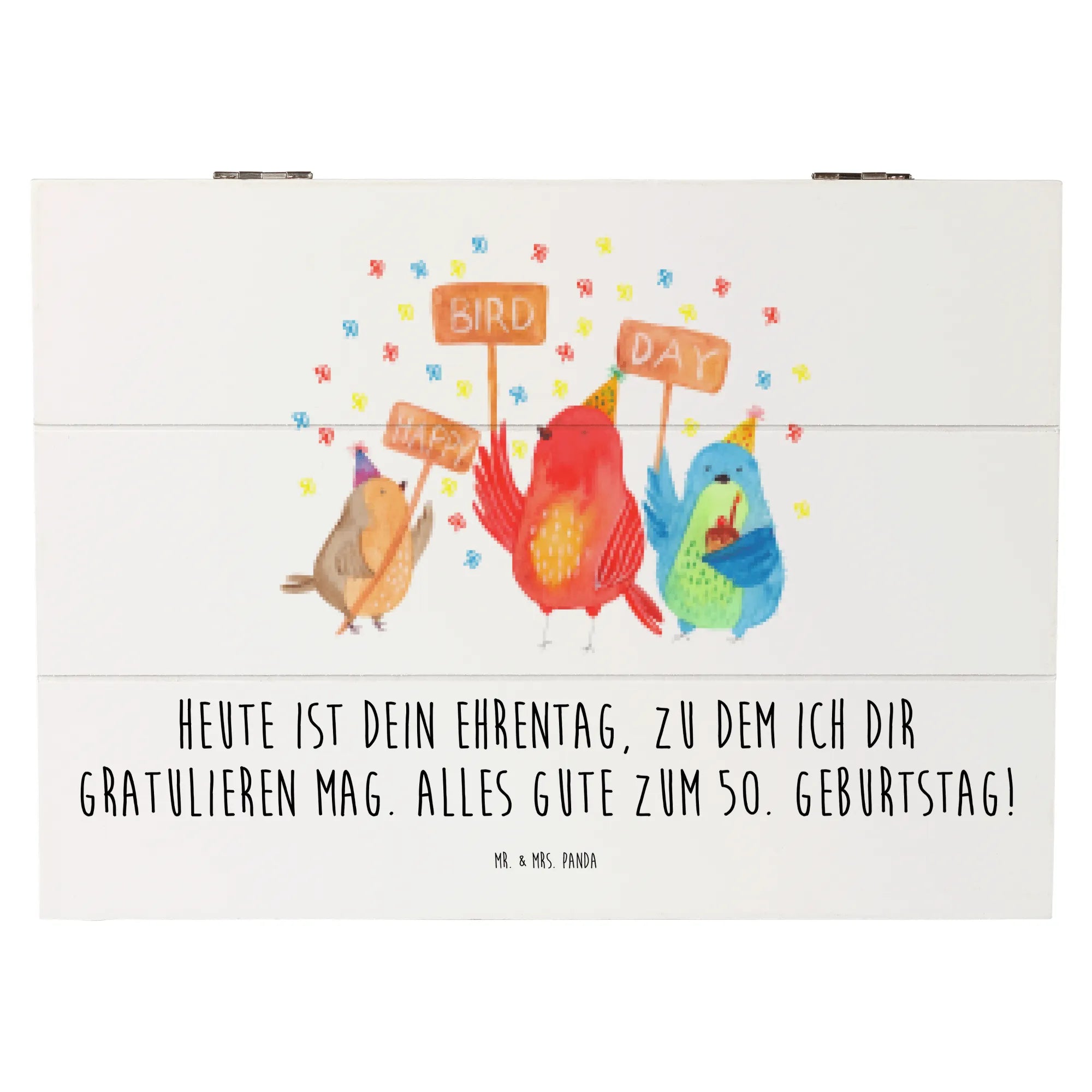 Entdecke die perfekte Holzkiste von Mr. & Mrs. Panda für den 50. Geburtstag! Diese wunderschöne Schatzkiste mit dem fröhlichen Motiv "Happy Bird Day" ist ein ganz besonderes Geschenk für jeden, der seinen Ehrentag feiert.