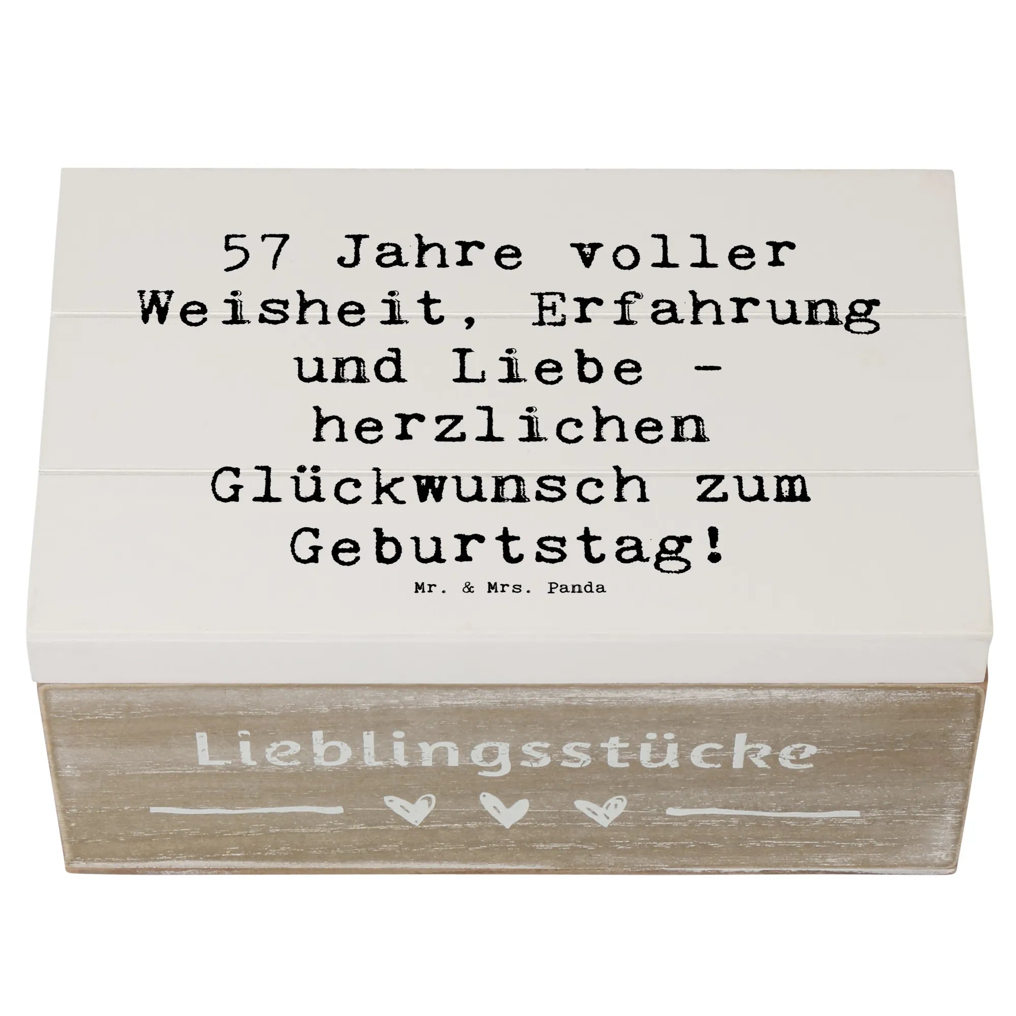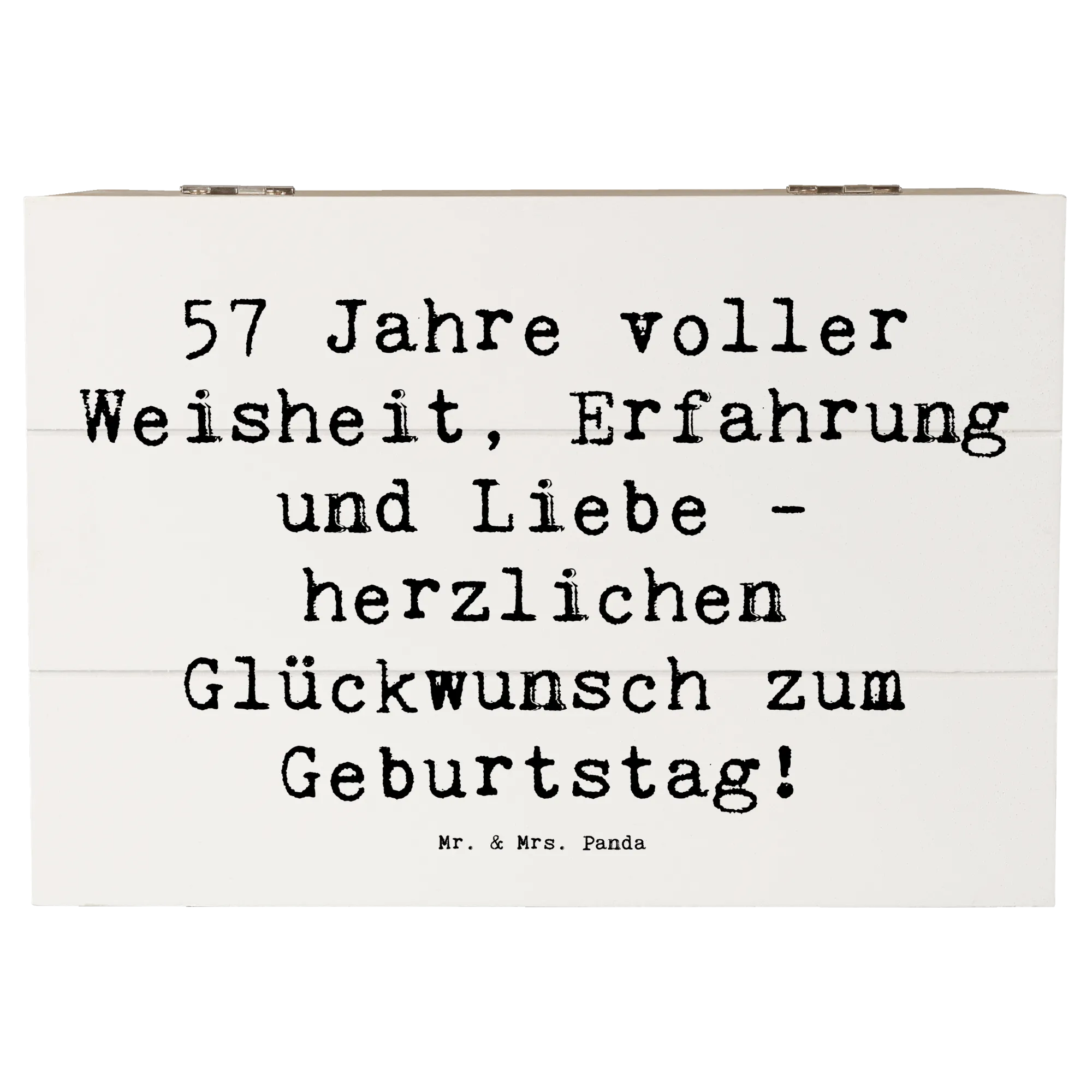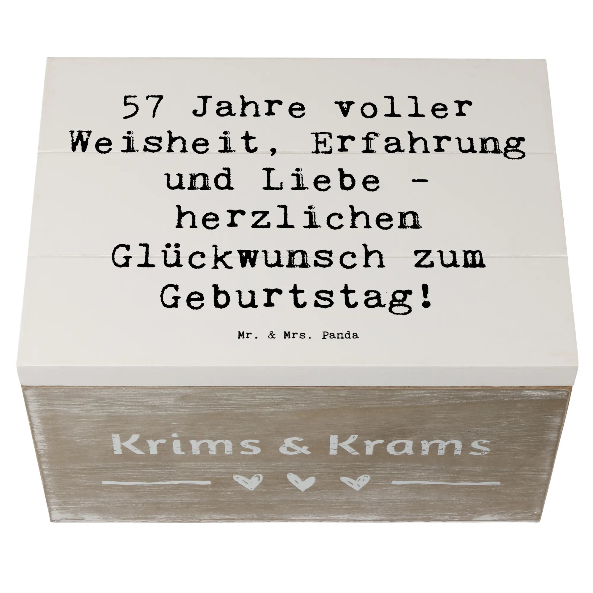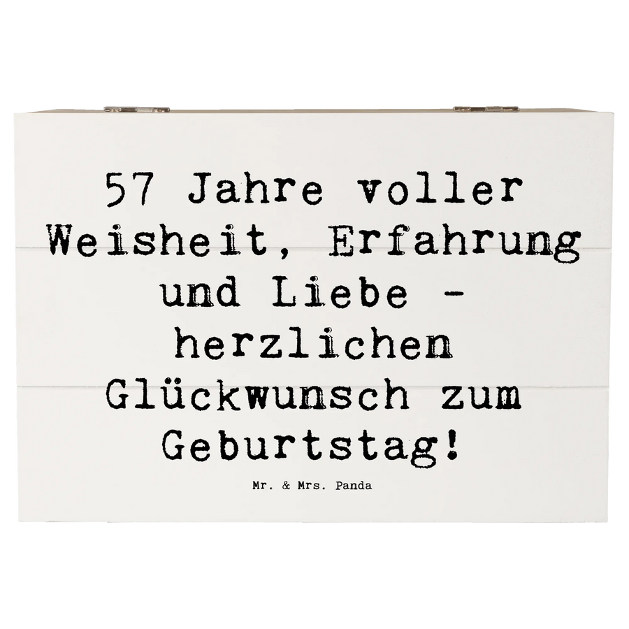 Die wunderschöne Holzkiste von Mr. & Mrs. Panda ist das perfekte Geschenk zum 57. Geburtstag! Mit dem liebevollen Spruch "57 Jahre voller Weisheit, Erfahrung und Liebe - herzlichen Glückwunsch zum Geburtstag!" wird diese Erinnerungskiste zu einem ganz besonderen Aufbewahrungsort für all die kleinen Schätze, die das Leben bereithält.
