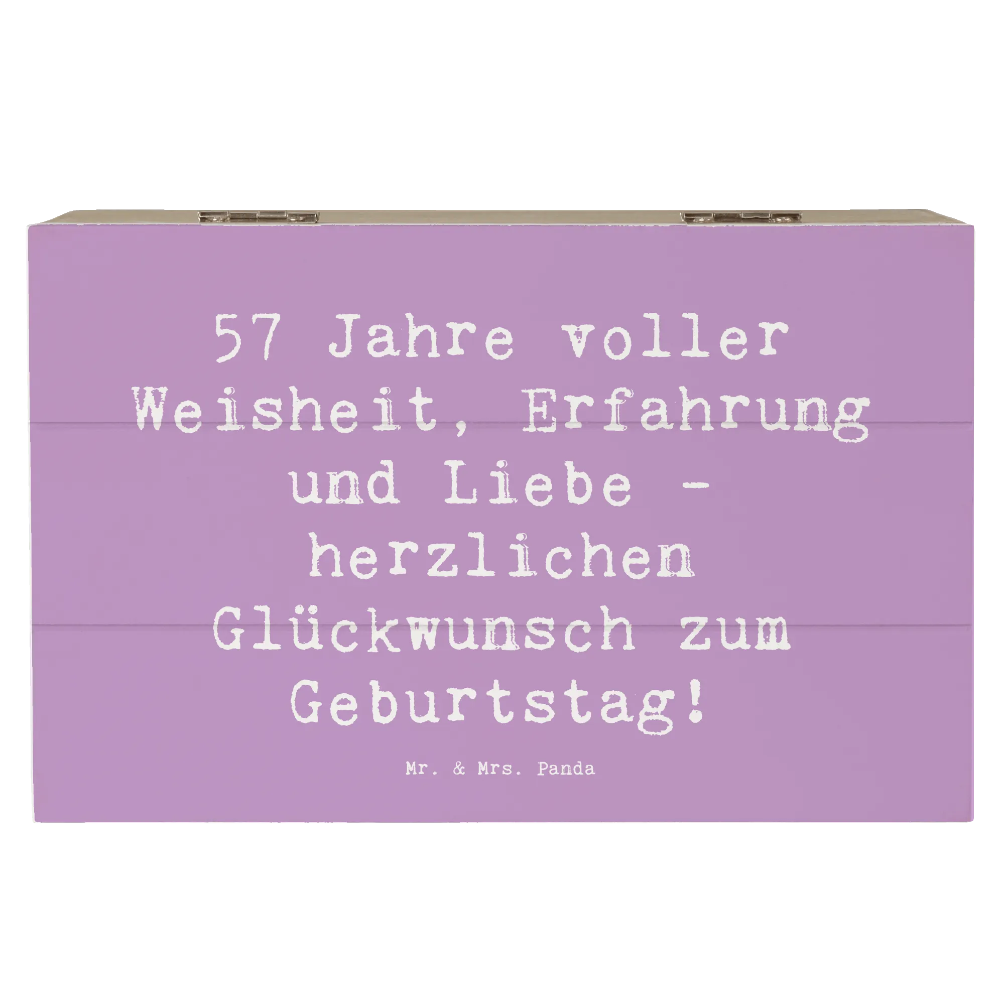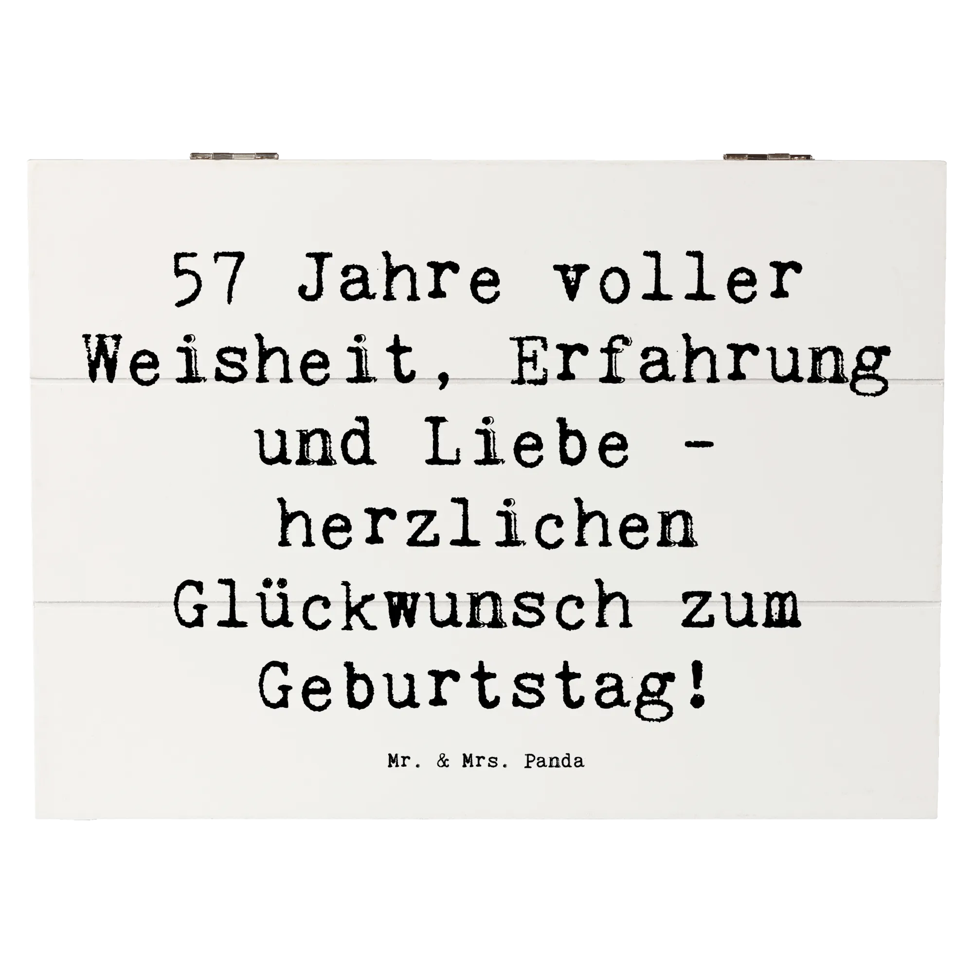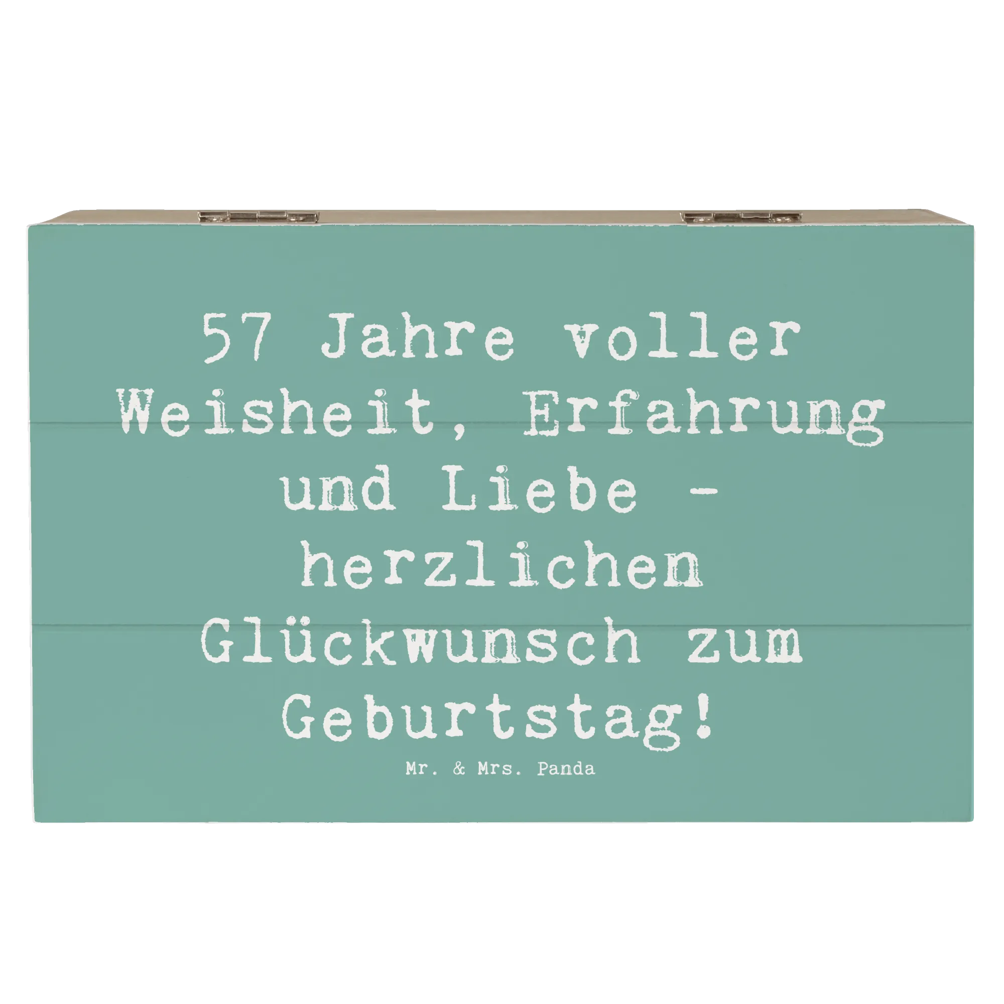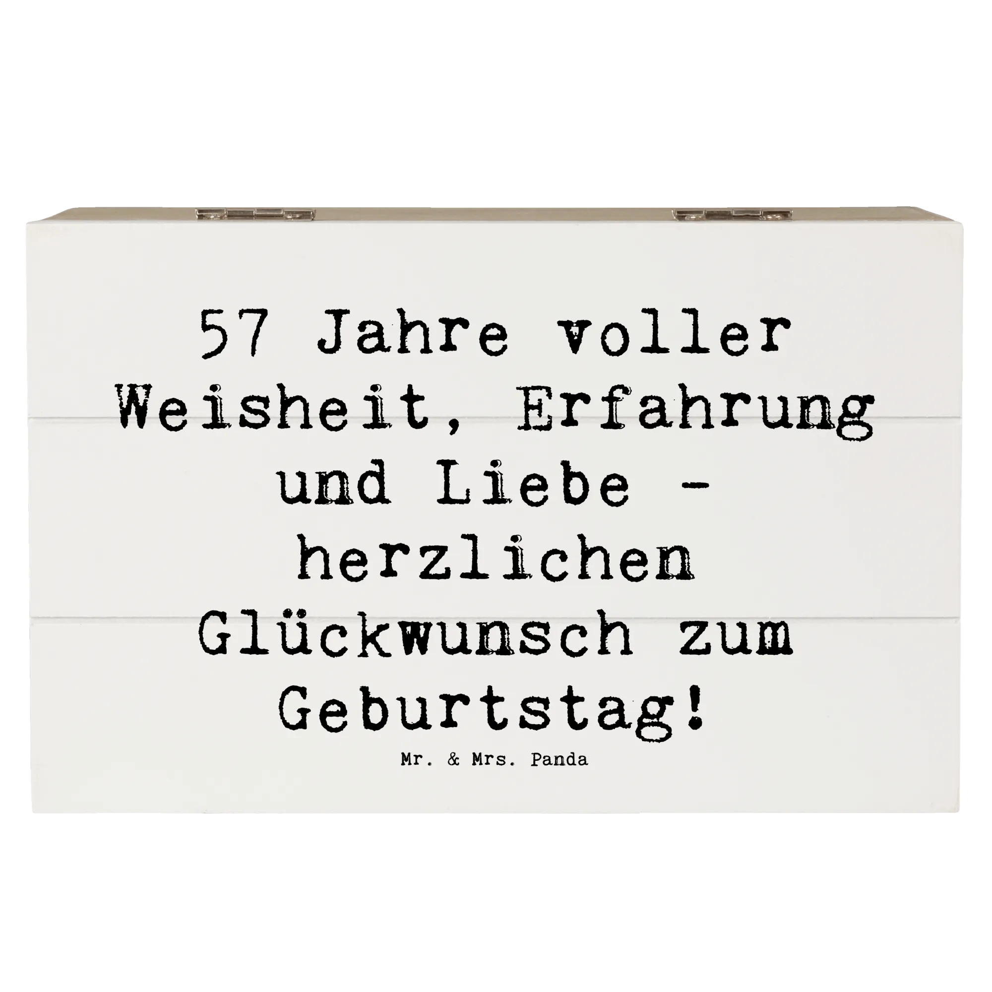 Die wunderschöne Holzkiste von Mr. & Mrs. Panda ist das perfekte Geschenk zum 57. Geburtstag! Mit dem liebevollen Spruch "57 Jahre voller Weisheit, Erfahrung und Liebe - herzlichen Glückwunsch zum Geburtstag!" wird diese Erinnerungskiste zu einem ganz besonderen Aufbewahrungsort für all die kleinen Schätze, die das Leben bereithält.