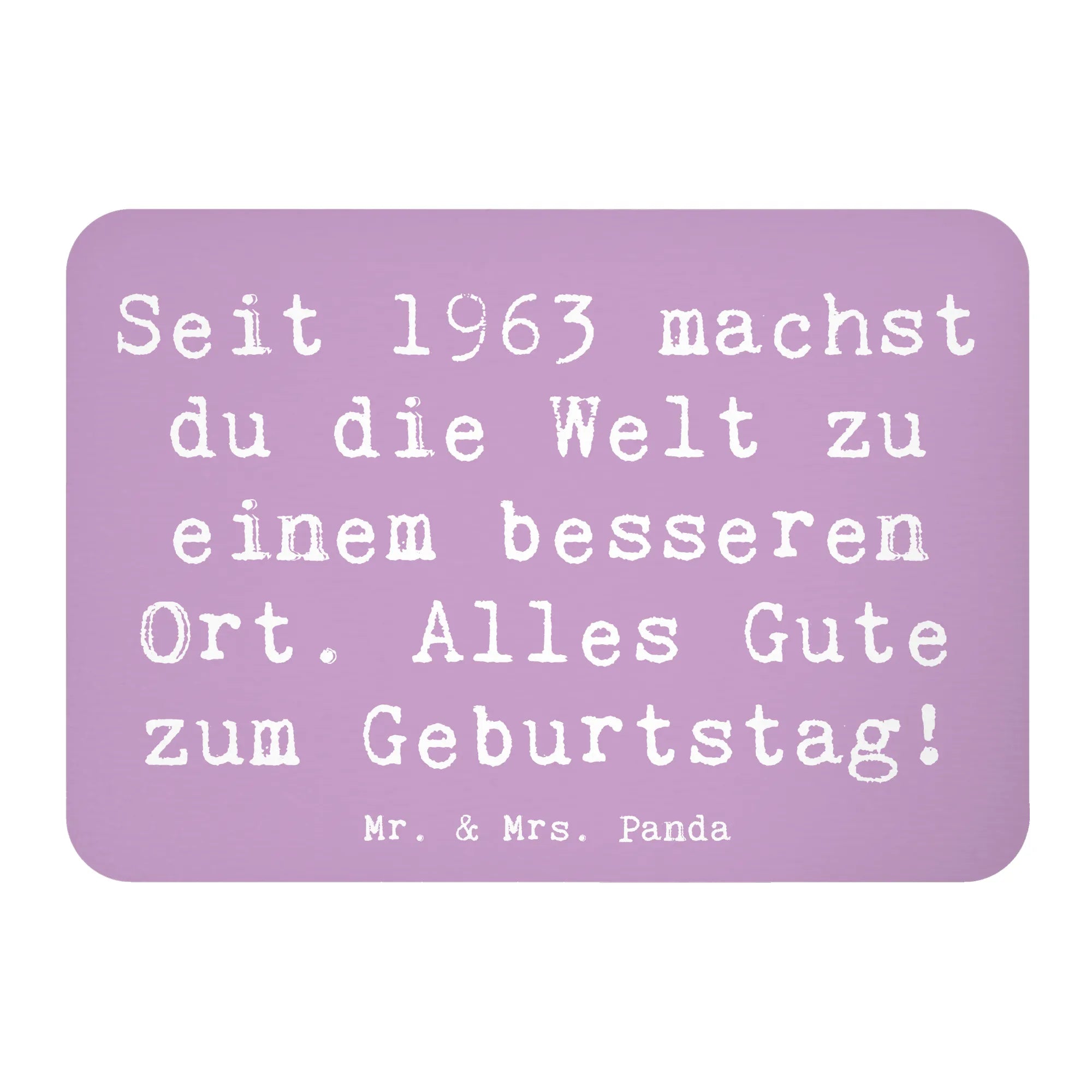 Entdecke unseren wunderbaren Kühlschrankmagneten 1963 Geburtstag von Mr. & Mrs. Panda! Dieser liebevoll gestaltete Magnet ist das perfekte Geschenk für all diejenigen, die im Jahr 1963 das Licht der Welt erblickt haben. Mit dem fröhlichen Slogan 'Seit 1963 machst du die Welt zu einem besseren Ort. Alles Gute zum Geburtstag!' zaubert er jedem Geburtstagskind ein Lächeln ins Gesicht.