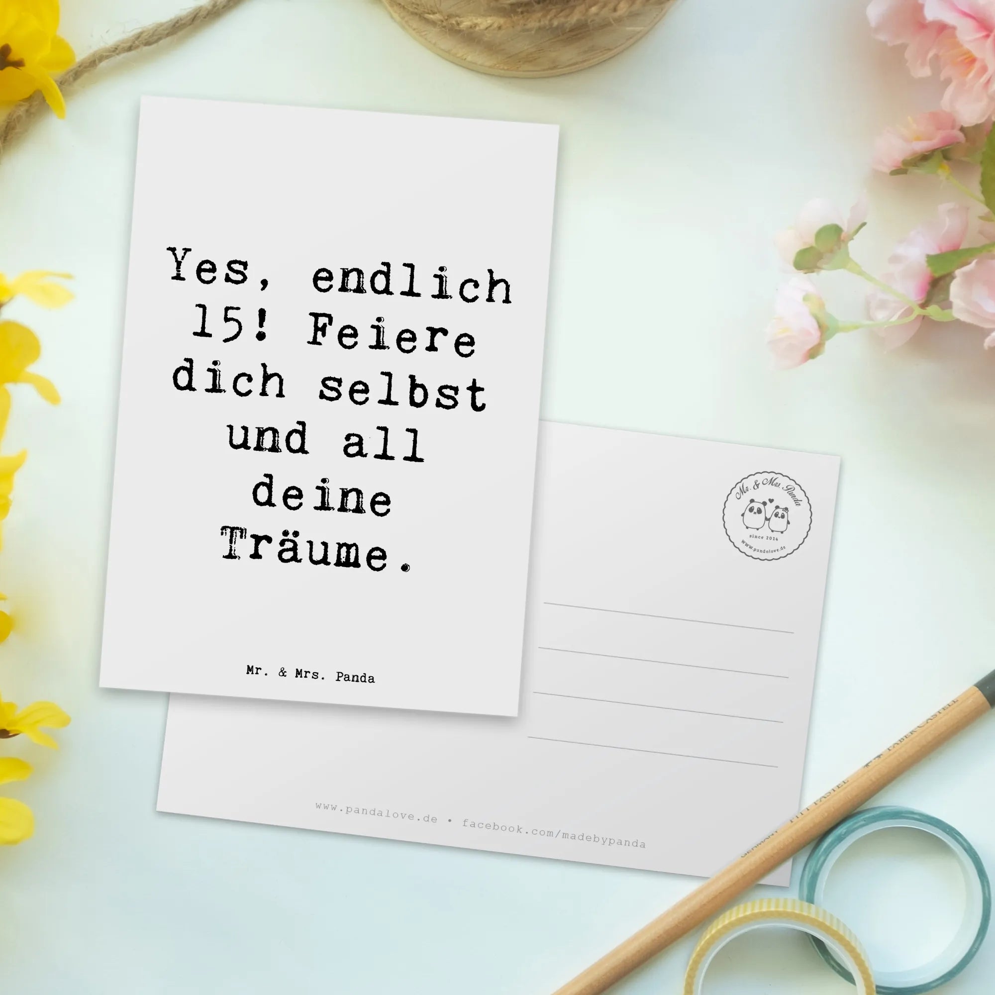 Die Karte gehört zur liebevollen Geburtstagskollektion "Geburtstag Alter" und wurde von Mrs. Panda aquarellhaft entworfen. Das Motiv ist als Nur Spruch Hochkant gestaltet – bewusst klar, fröhlich und motivierend. Der Satz "Yes, endlich 15! Feiere dich selbst und all deine Träume." ist ideal für Geburtstagsgrüße, Glückwunschkarten 15 Jahre, als Beilage zum Geschenk oder als Einladung zur Party.