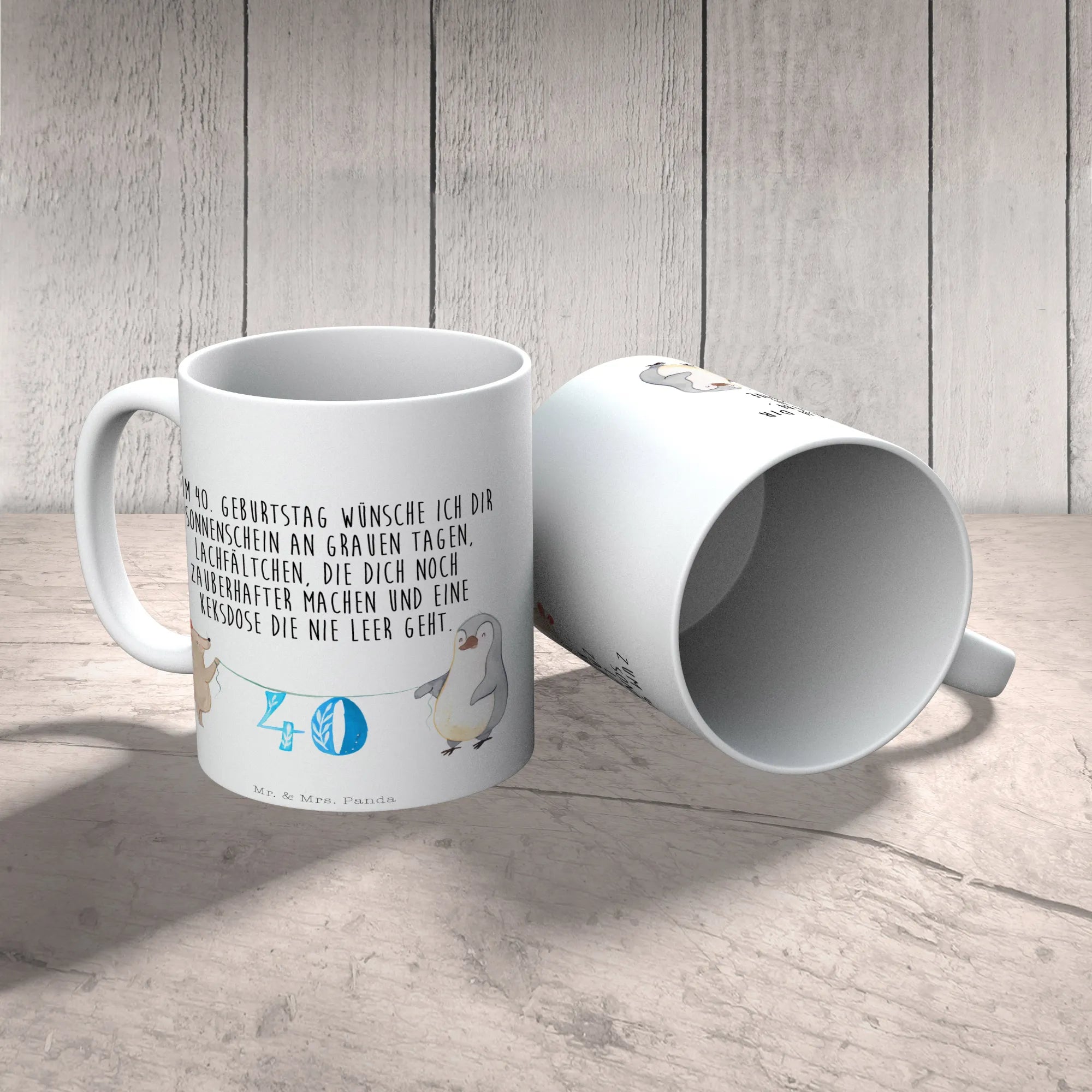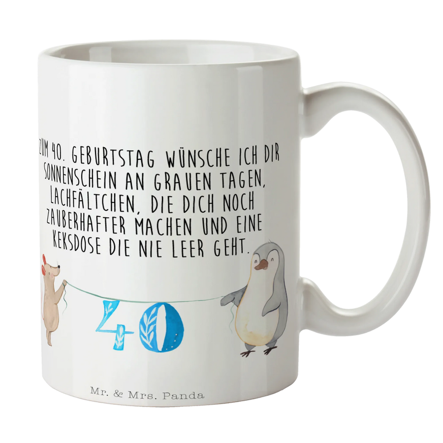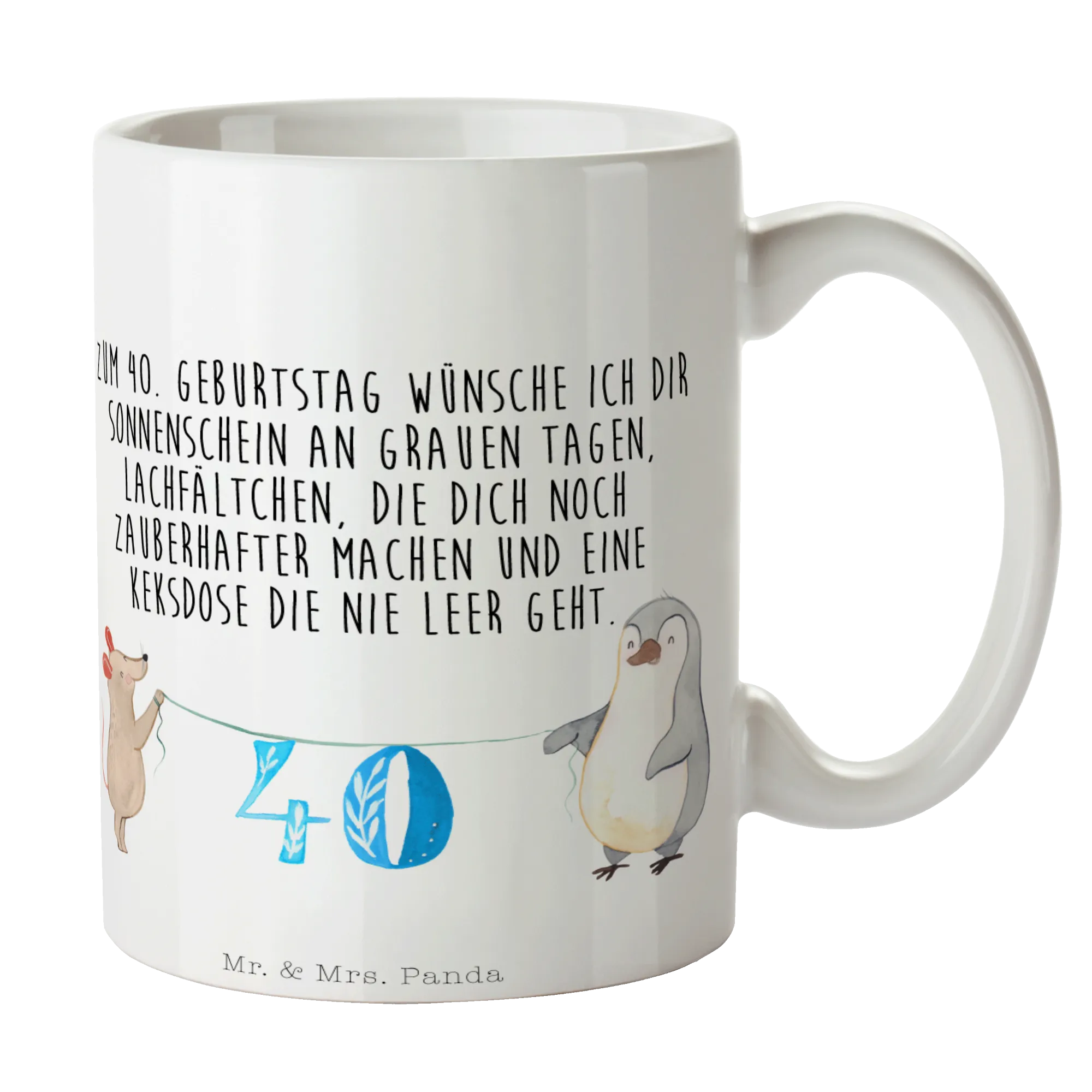 Entdecke die wundervolle Tasse zum 40. Geburtstag mit unserem süßen Motiv Maus und Pinguin! Diese liebevoll gestaltete Keramiktasse von Mr. & Mrs. Panda bringt nicht nur Freude, sondern auch eine ganz besondere Botschaft. Sie ist das perfekte Geschenk für alle, die ihren 40. Geburtstag gebührend feiern wollen. Der herzliche Slogan 'Zum 40. Geburtstag wünsche ich dir Sonnenschein an grauen Tagen, Lachfältchen, die dich noch zauberhafter machen und eine Keksdose, die nie leer geht.' lässt jeden Kaffeetrinker und Teeliebhaber lächeln.