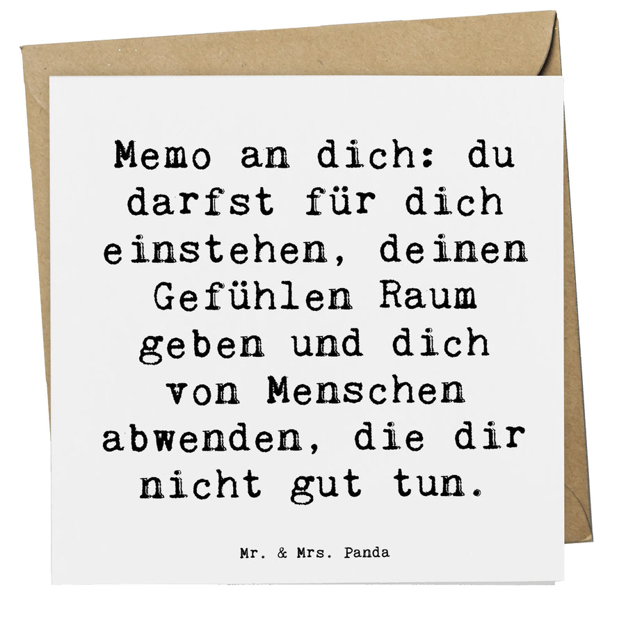 Die Karte präsentiert einen wunderschönen Spruch: "Memo an dich: du darfst für dich einstehen, deinen Gefühlen Raum geben und dich von Menschen abwenden, die dir nicht gut tun." Dieses Motiv inspiriert und motiviert, genau das zu tun und das eigene Wohlbefinden in den Vordergrund zu stellen.