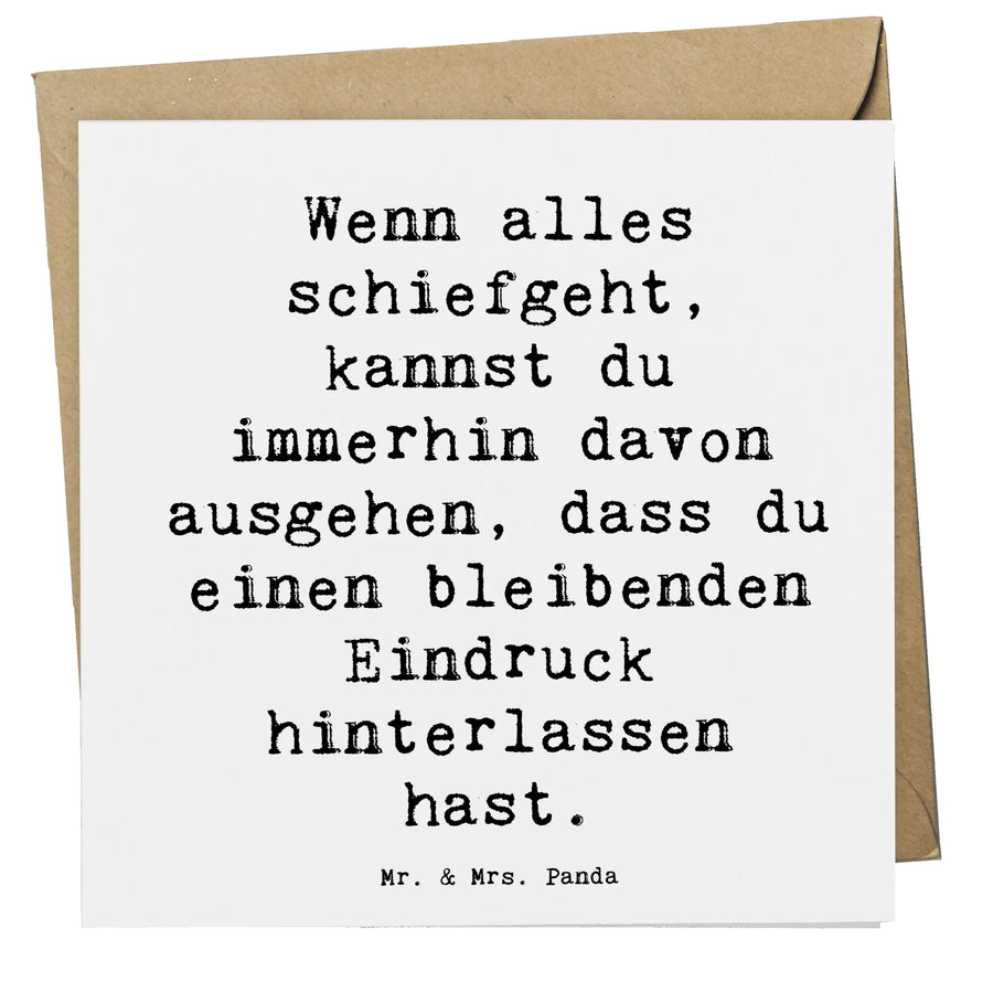 Die Karte hat die praktischen Maße von 140 mm x 140 mm, sodass du genügend Platz hast, um deine persönlichen Worte und Gedanken auf der blanko Innenseite niederzuschreiben. Auf der Vorderseite der Karte prangt der inspirierende Spruch: "Wenn alles schiefgeht, kannst du immerhin davon ausgehen, dass du einen bleibenden Eindruck hinterlassen hast." Dieser Spruch eignet sich perfekt, um Mut zu machen und ein Lächeln auf die Lippen des Empfängers zu zaubern.