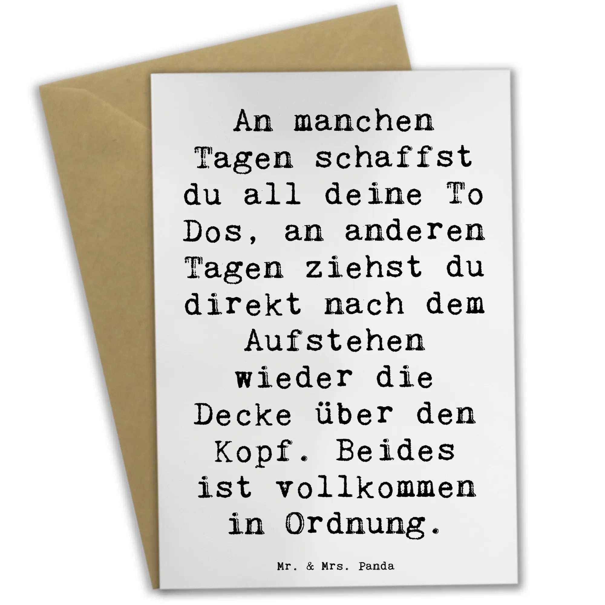 Die Grußkarte "Tapferkeit" von Mr. & Mrs. Panda ist der perfekte Begleiter für all jene besonderen Momente im Leben. Sie überzeugt durch ihr liebevolles Design und den ermutigenden Spruch: "An manchen Tagen schaffst du all deine To Dos, an anderen Tagen ziehst du direkt nach dem Aufstehen wieder die Decke über den Kopf. Beides ist vollkommen in Ordnung." Diese Karte aus der einzigartigen Kollektion Gefühle & Stimmungen ist ideal, um Mut und Beistand zu spenden.