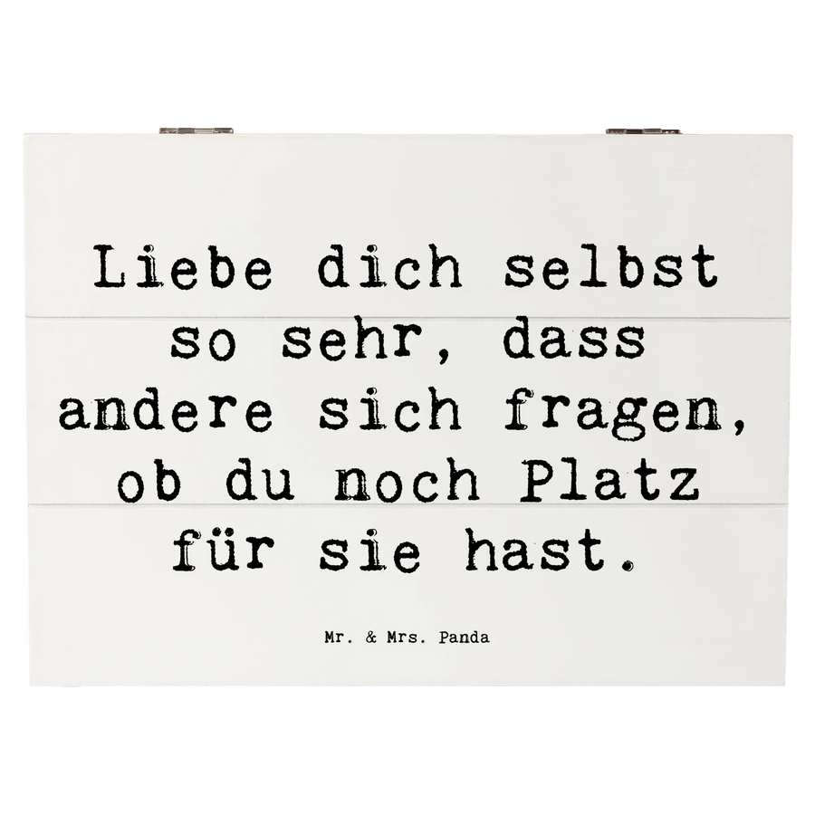 Entdecke die wunderschöne Holzkiste von Mr. & Mrs. Panda, die perfekt für jeden Anlass ist! Diese besondere Kiste mit dem Motiv Selbstakzeptanz und dem inspirierenden Spruch "Liebe dich selbst so sehr, dass andere sich fragen, ob du noch Platz für sie hast" ist nicht nur ein toller Blickfang, sondern auch ein vielseitiges Aufbewahrungsobjekt.