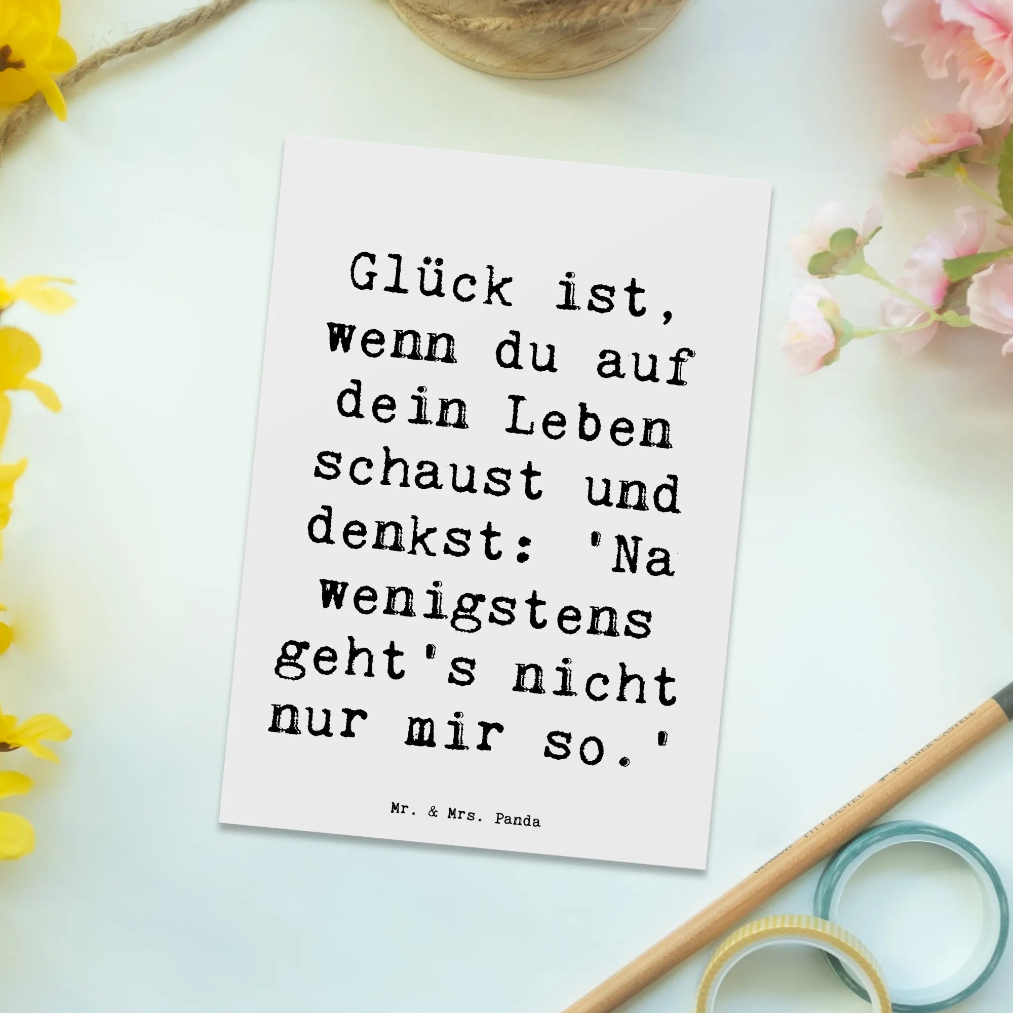 Der Spruch 'Glück ist, wenn du auf dein Leben schaust und denkst: 'Na wenigstens geht's nicht nur mir so.' lädt zum Schmunzeln ein und erinnert uns daran, dass wir alle in ähnlichen Boots sitzen und gemeinsam Freude und Herausforderungen erleben.