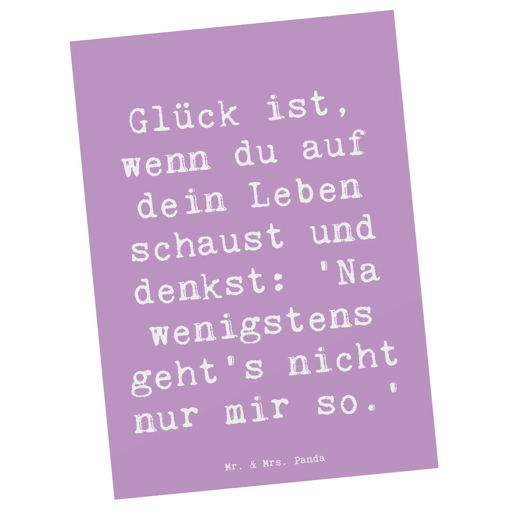 Diese zauberhafte Grußkarte trägt den frechen und tröstlichen Spruch: "Glück ist, wenn du auf dein Leben schaust und denkst: 'Na wenigstens geht's nicht nur mir so.'" – ein Satz, der zum Schmunzeln und zum Zusammenhalten einlädt. Die sanfte Lavendeltraum-Farbe macht die Karte besonders freundlich und sorgt für einen Blickfang auf jedem Geschenktisch oder in jedem Briefkasten. 💜