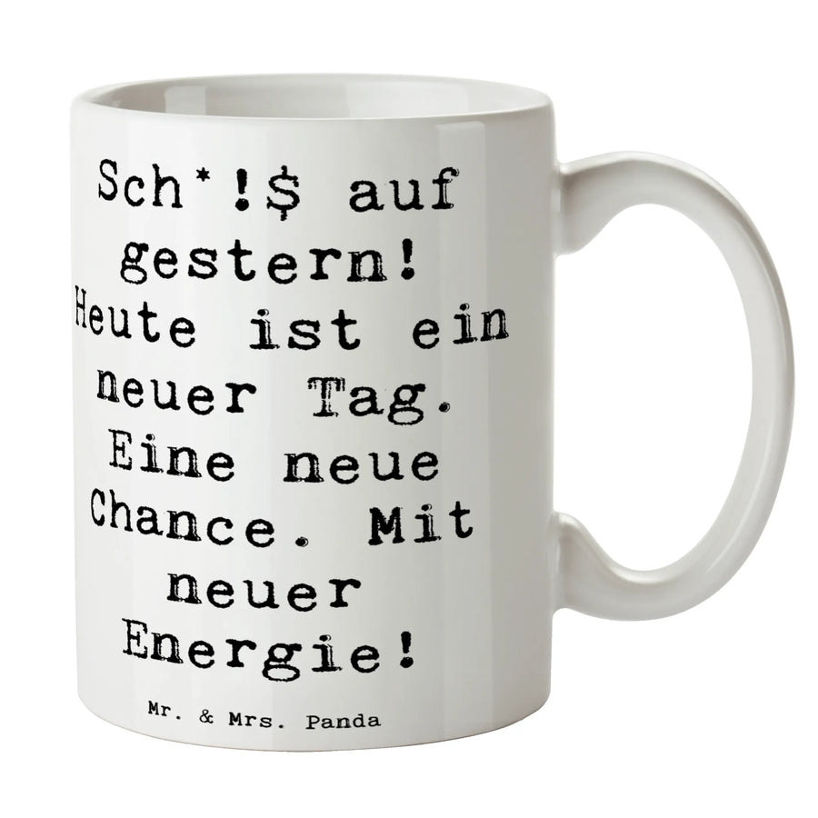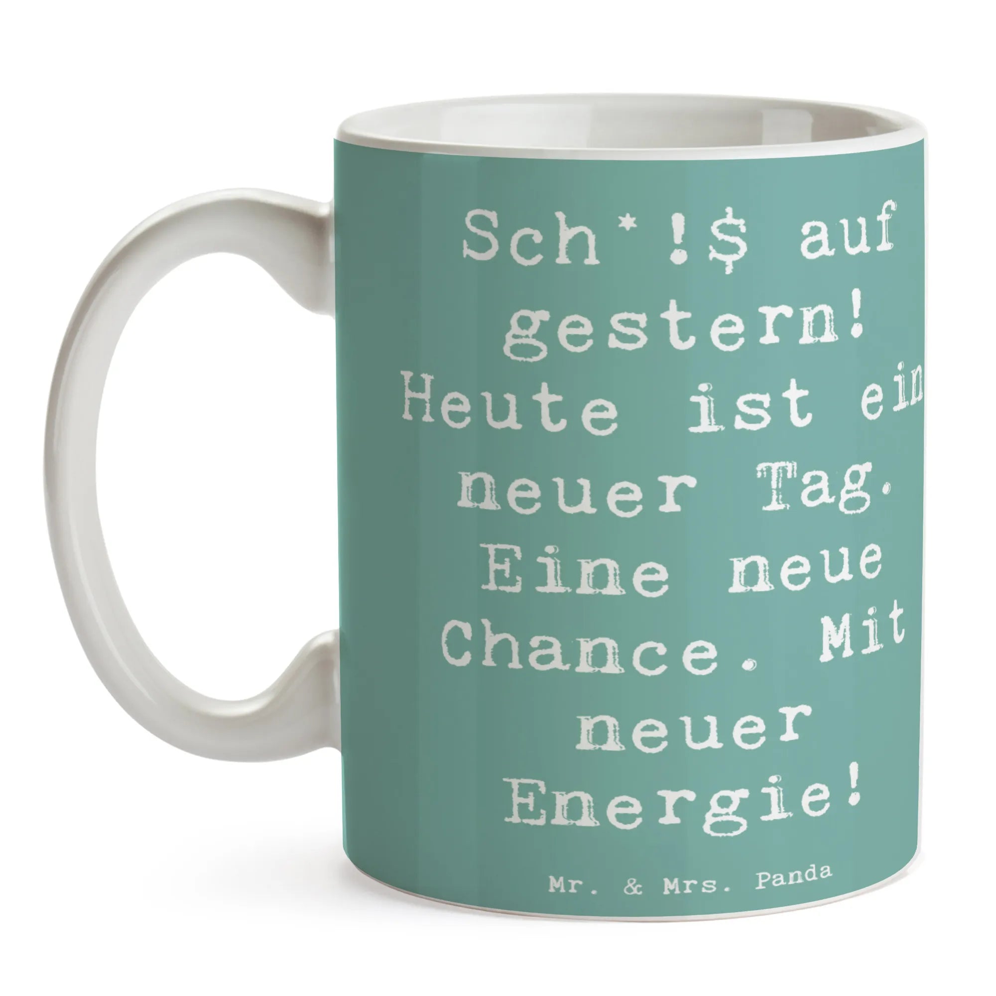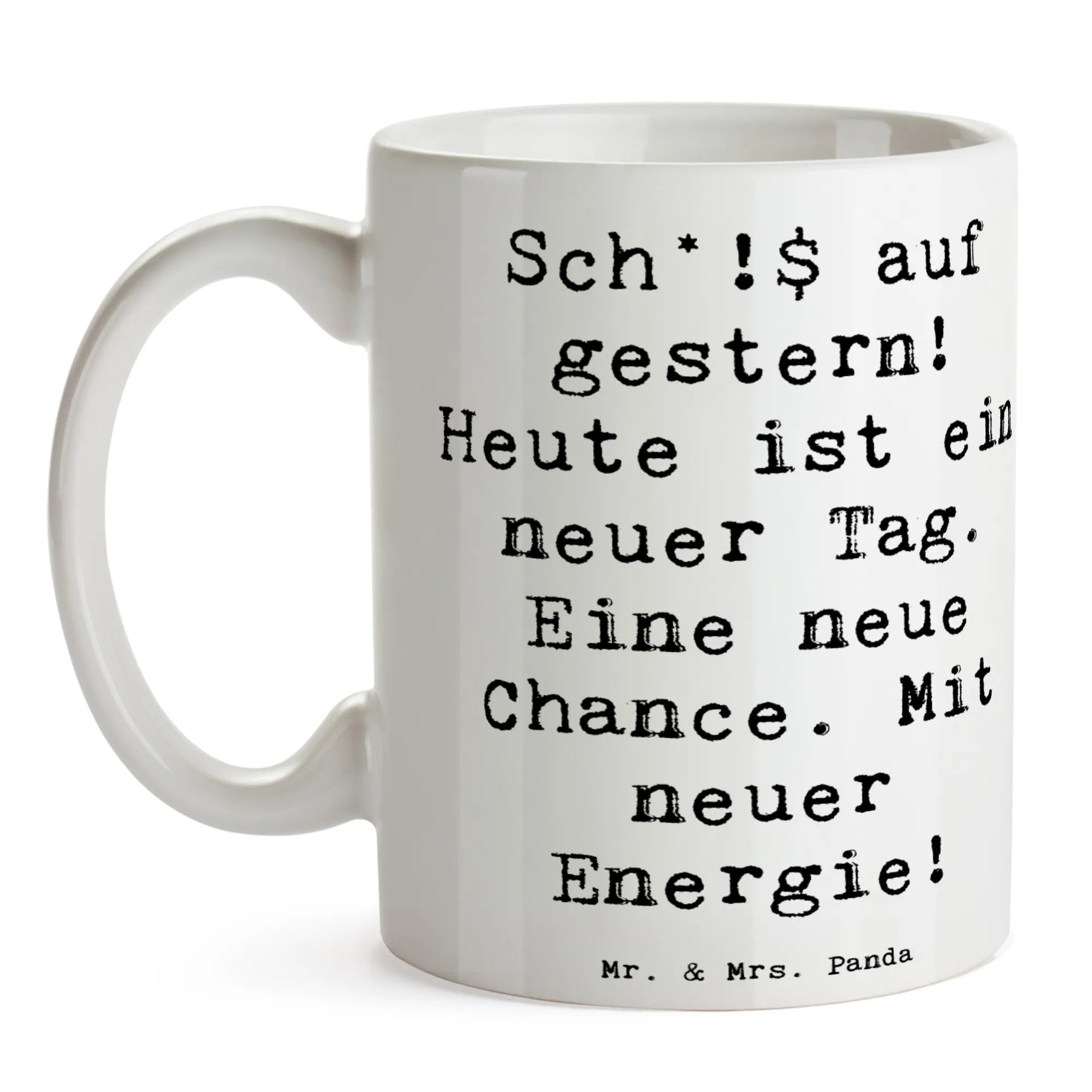 Mit dem Spruch "Sch*!$ auf gestern! Heute ist ein neuer Tag. Eine neue Chance. Mit neuer Energie!" wird diese Tasse zu einem Inspirationsträger für all jene, die das Gefühl der Unsicherheit überwinden möchten. Egal ob im Büro, zu Hause beim morgendlichen Kaffee oder beim Teetrinken am Abend, diese Designer Tasse bringt gute Laune ins Spiel.