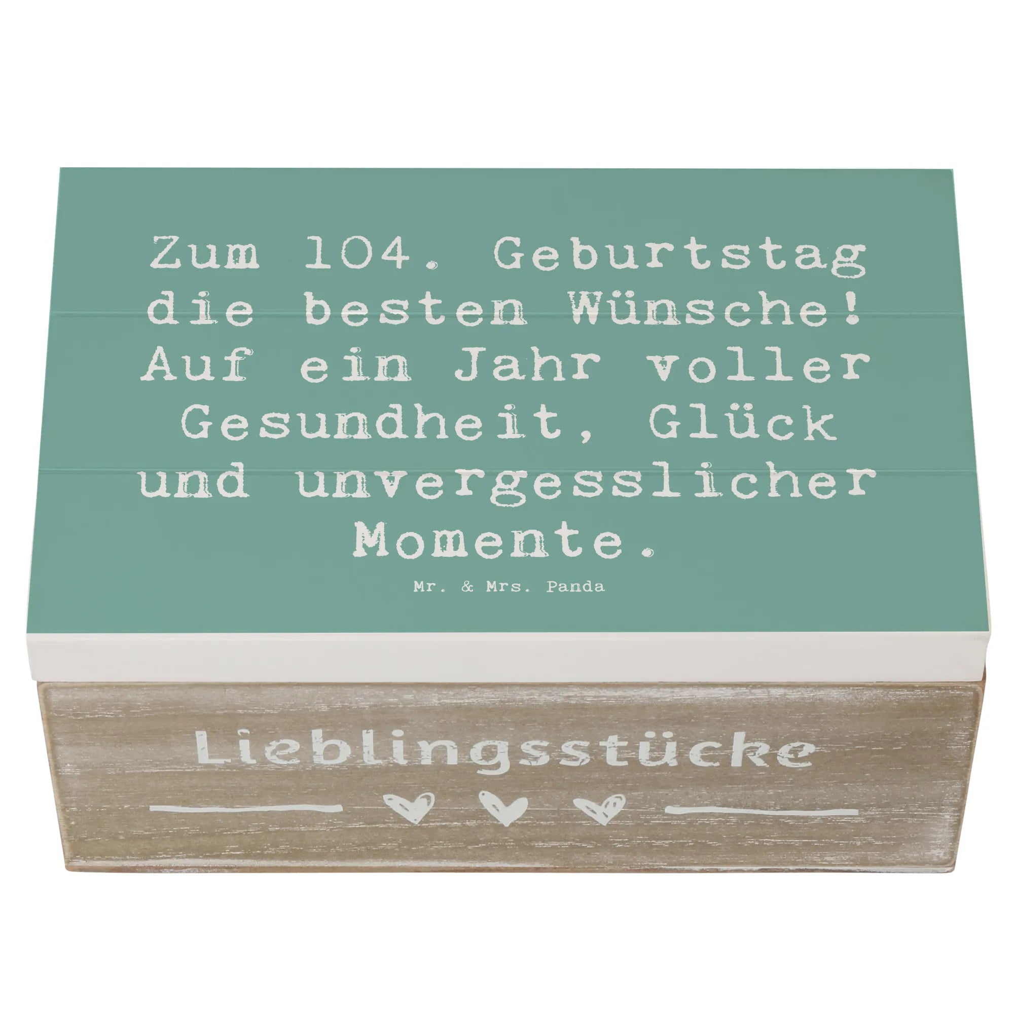 Wenn Du auf der Suche nach dem perfekten Geschenk zum 104. Geburtstag bist, dann ist die wunderschöne Holzkiste von Mr. & Mrs. Panda die ideale Wahl! Diese liebevoll gestaltete Kiste ist nicht nur ein tolles Aufbewahrungsaccessoire, sondern auch ein ganz besonderes Erinnerungsstück für den Jubilar oder die Jubilarin. Die robuste Holzkiste besticht durch ihr einzigartiges Design und den liebevollen Spruch: 'Zum 104. Geburtstag die besten Wünsche! Auf ein Jahr voller Gesundheit, Glück und unvergesslicher Momente.' So wird jede Kiste zu einem individuellen Schatz, der die schönsten Erinnerungen bewahrt.