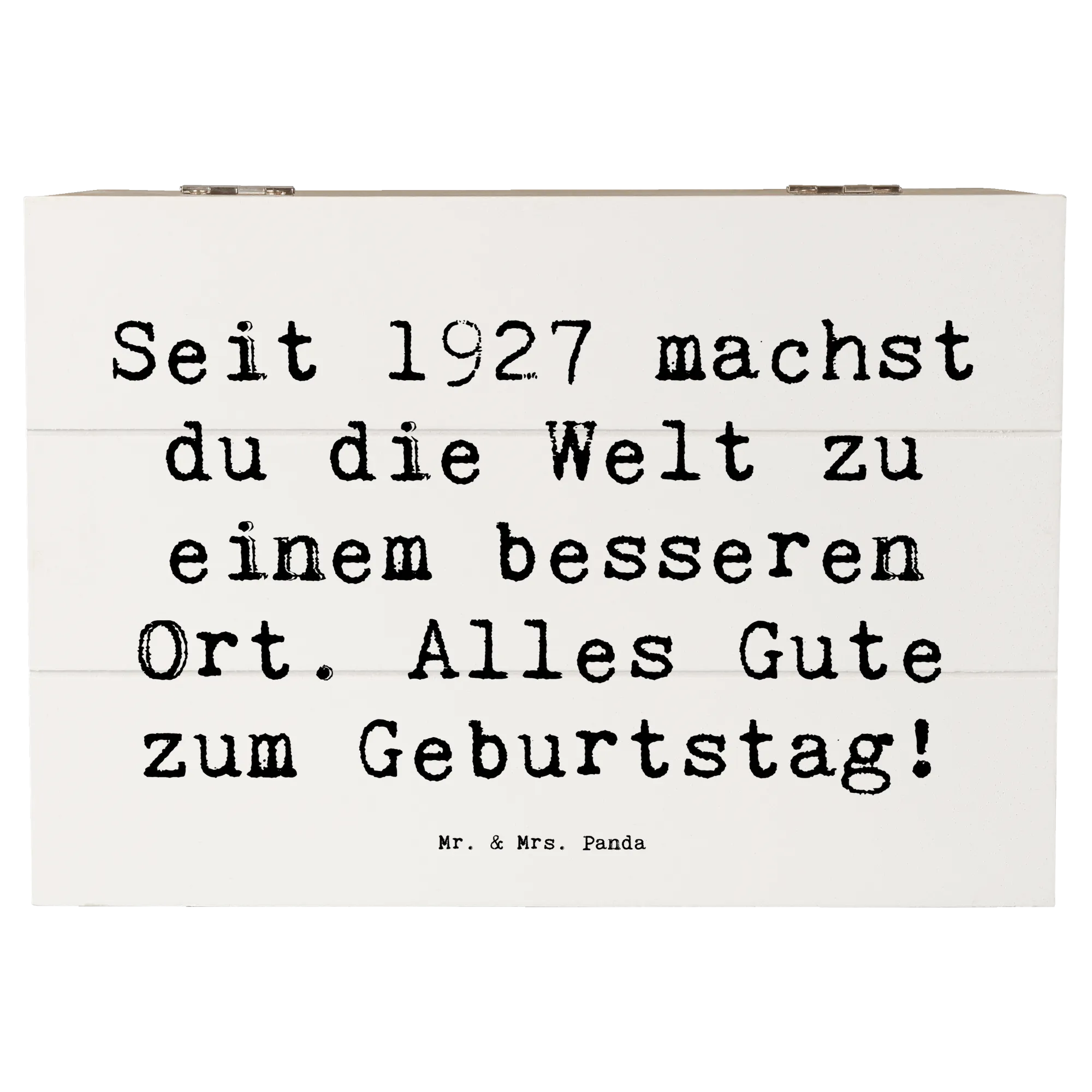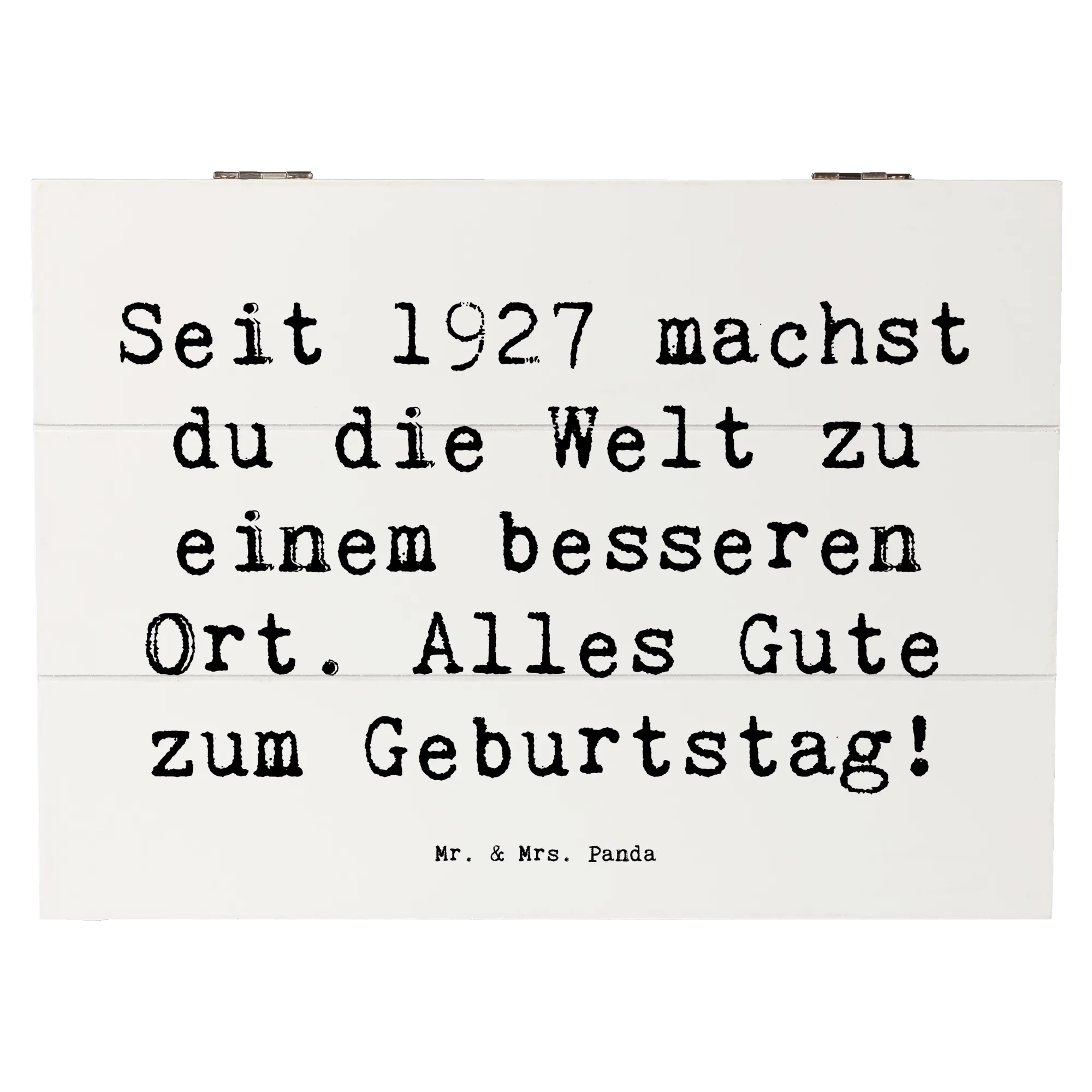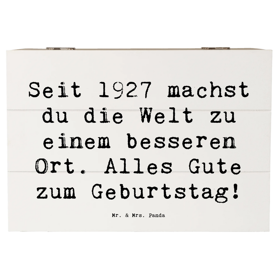 Die wunderschöne Holzkiste von Mr. & Mrs. Panda ist das perfekte Geschenk für jeden Geburtstag! Diese spezielle Erinnerungskiste mit dem Motiv "1927 Geburtstag" und dem liebevollen Spruch "Seit 1927 machst du die Welt zu einem besseren Ort. Alles Gute zum Geburtstag!" ist nicht nur ein Hingucker, sondern auch eine nachhaltige und praktische Aufbewahrungsbox.