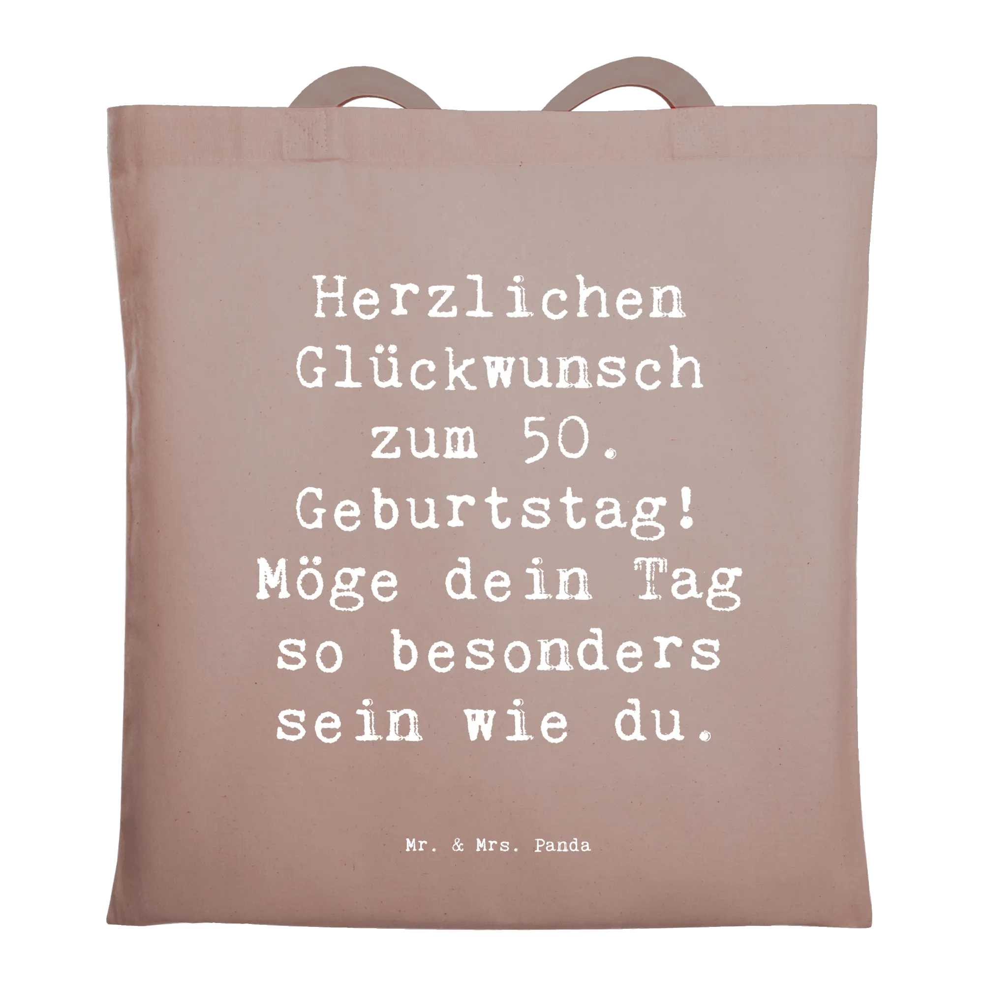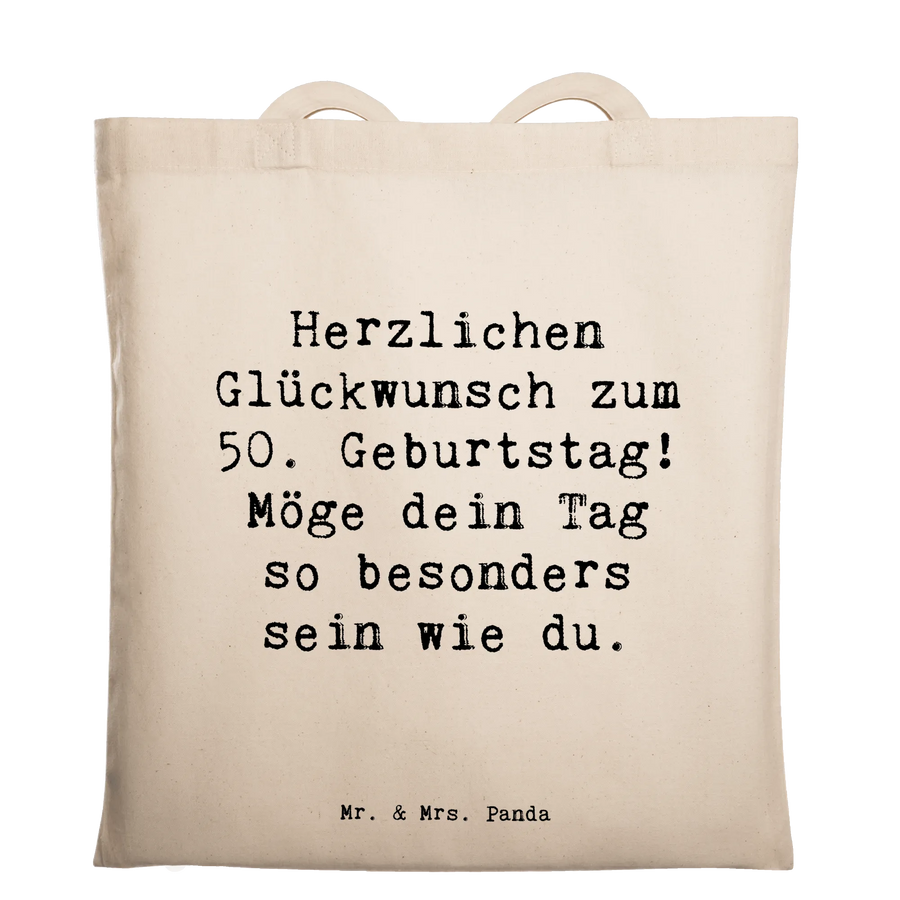 Die Tragetasche "Herzlichen Glückwunsch zum 50. Geburtstag! Möge dein Tag so besonders sein wie du." von Mr. & Mrs. Panda ist der perfekte Begleiter für jeden Anlass, besonders zum runden Geburtstag! Diese hochwertige Baumwolltasche vereint Funktionalität und stilvolles Design und sollte in keinem Haushalt fehlen. Ob als Einkaufstasche, Strandtasche oder einfach als schicke Umhängetasche – mit ihren großzügigen Abmessungen von 420 mm x 380 mm bietet sie ausreichend Platz für alles, was Du brauchst. Die Tragetasche wurde mit viel Liebe zum Detail bedruckt und kombiniert niedliche Motive mit einem liebevollen Spruch, der jeden Geburtstag auf besondere Weise würdigt.