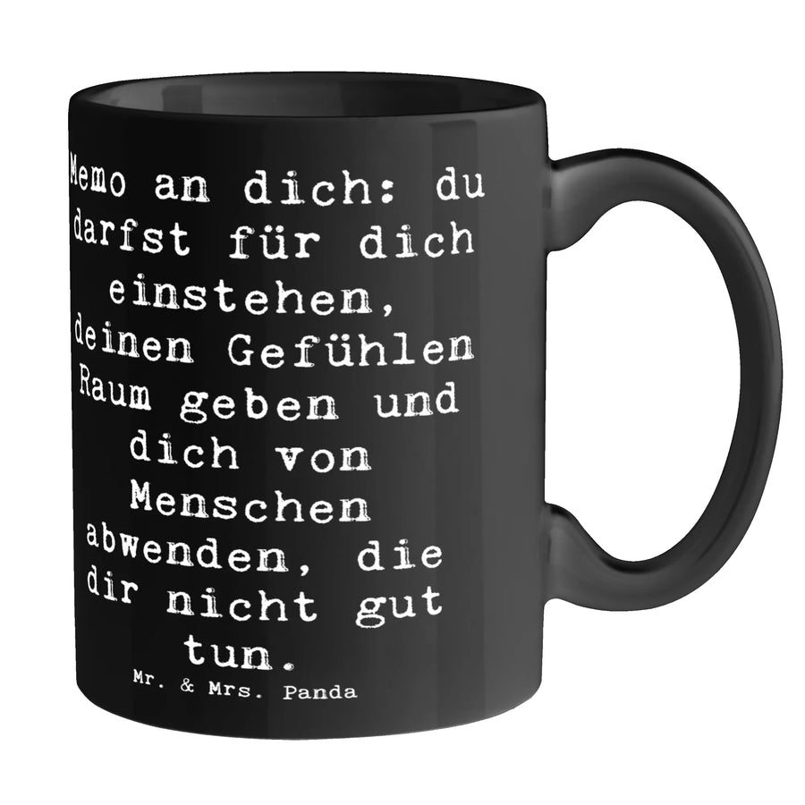 Das brillante Design zeigt den Slogan: "Memo an dich: du darfst für dich einstehen, deinen Gefühlen Raum geben und dich von Menschen abwenden, die dir nicht gut tun." Mit ihrer besonderen, glänzenden Oberfläche und dem Lavendeltraum-Hintergrund ist die Tasse nicht nur funktional, sondern auch ein echter Hingucker.