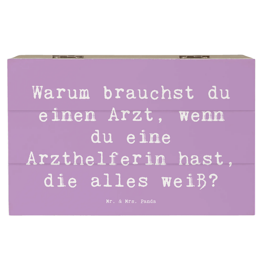 Das Material aus robuster Holzfaser sorgt dafür, dass die Kiste besonders stabil und langlebig ist, was sie zu einer nachhaltigen Wahl macht. Durch die einzigartigen Einschlagscharniere lässt sie sich einfach öffnen und schließen, während das charmante Motiv mit dem Spruch 'Warum brauchst du einen Arzt, wenn du eine Arzthelferin hast, die alles weiß?' für ein Schmunzeln sorgt.